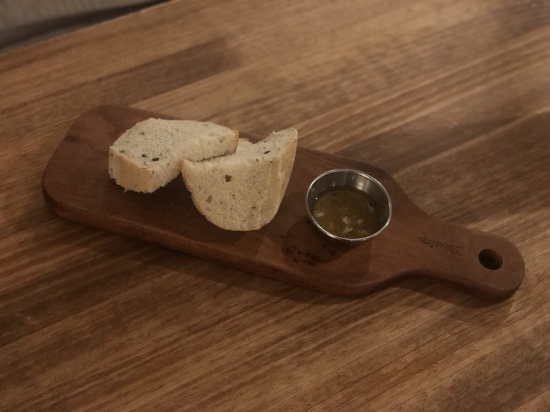 잠시 뒤에 샐러드와 식전빵이 나왔다. 가격대에 비해서 한없이 친절한 접객 태도가 인상깊었다. 빵은 조금 찰기와 수분이 있었다. 찹쌀가루가 함유된 건가 짐작도 해보며 발사믹과 올리브유가 섞인 소스에 찍어 싹 비운다.