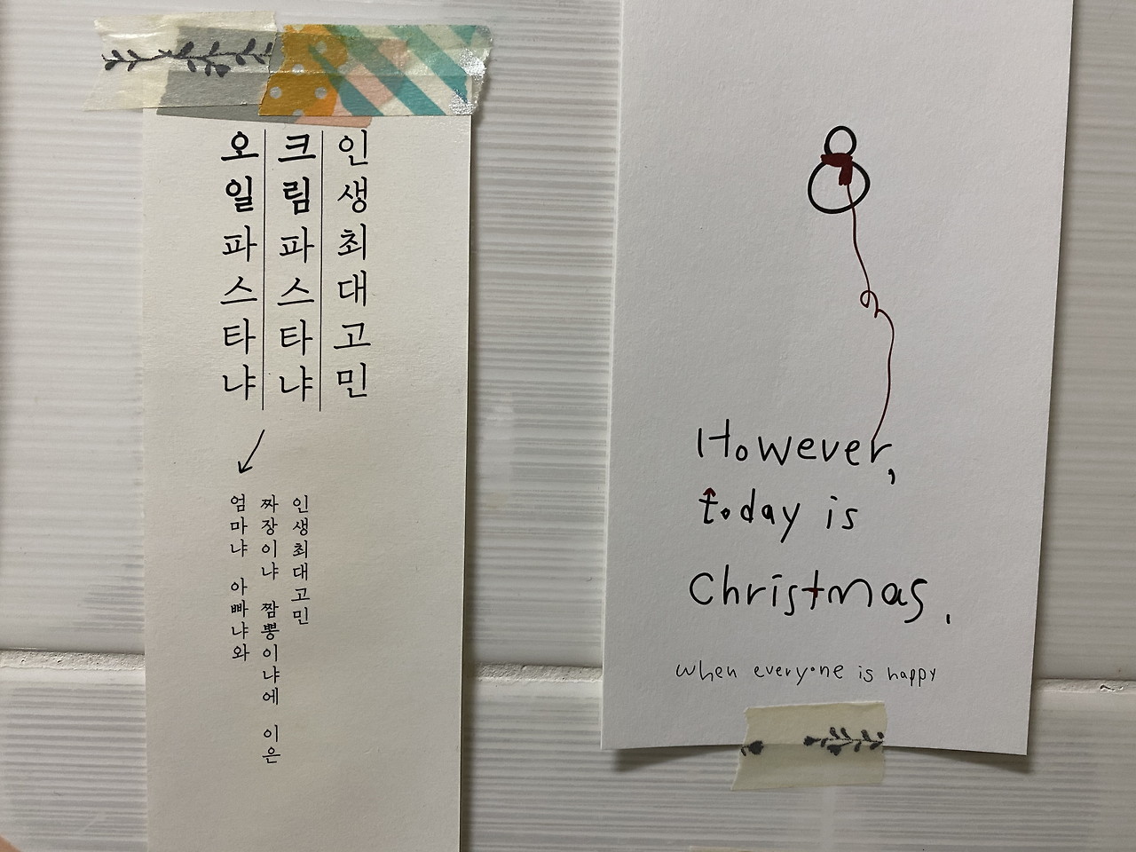 자리를 뜨기 전에 화장실에 들어갔다가 벽면에 붙여둔 책갈피의 문구 하나에 눈이 박혔다. “오일파스타냐 크림파스타냐 인상 최대 고민” 그리고 다른 몇가지 낙서 같은 쪽지들, 또 몇가지 사진들. 그리고 조금전에 바깥양반이 설명해줬던 "요리하는 남편과 디자이너 아내"에 대한 설명이 포함된 메뉴판과 가게 안내도 함께 붙어있었다. 화장실에 들어가다 말고 한참이나 우두커니 서서 벽에 붙은 여러가지를 꼼꼼히 읽었다. 그리고 화장실에서 나왔을 땐 모든 것이 달라져 있었다.