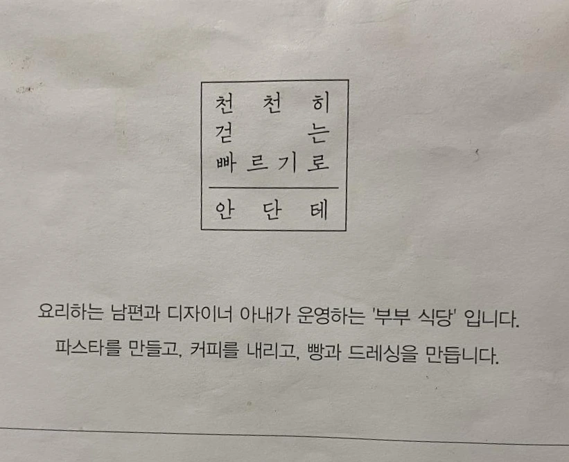 카페를 좋아하는 바깥양반, 요리를 좋아하는 내가 함께 카페를 차리고 싶다는 꿈은 너무 먼 미래의 일이라 우리가 이것을 화제에 올리는 일도 많지 않고, 그리고 그것이 처음 식당에 와서 바깥양반이 던지는 한두마디 말 이상의 것으로 발전하진 않는다. 결정적으로 커피를 먹지 못하는 탓에 바깥양반의 역할을 우린 스스로 제약하고 있다. 그런데 안단테에선 그런 관습이 극복되었다. 부부가 함께 운영하는 식당의 어여쁜 꾸밈새와 유머러스함, 그리고 무엇보다도 구석구석 드러나는 손때의 매무새가 나에게 오래된, 먼 미래에 대한 꿈에 현실의 색을 입혔다. 바로 손을 뻗으면 닿을 거리로.