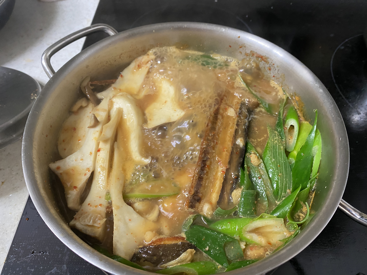 아쉬움은 아쉬움이고, 이미 국을 끓이려고 물을 올린 참이라 그냥 고대로 물에 텀벙텀벙 담궜다. 자아 국을 끓일까 어떻게 할까...팔팔 끓는 국물을 우선 한번 맛봤다. 짭짤하니 고소하다. 이때쯤 엄마에게 전화를 걸었는데, 한번 받지 않으셔서 잠시 후에 두번째 시도만에 통화가 되었다.