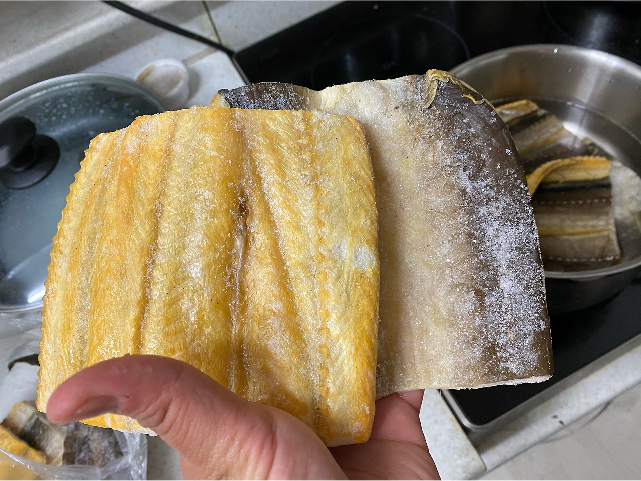 내일 아침 먹을 국을 끓이려고 냉동실을 열어 국거리를 찾다가, 봉지에 쌓인 생선 포를 발견했다. 우럭 포려니. 그래 얼갈이 넣어서 시원하게 국이나 끓이자 하고 봉지를 끄집어냈다. 엄마가 자주 드시는 요리인데, 특히 아빠는 퍽 좋아하신다. 말린 우럭을 간단하게 양념한 국물에 한소끔 끓이기만 해도, 농축된 우럭의 육즙이 빼어난 국물을 만들어낸다. 다만, 말리고 냉동보관을 오래하면서 군내가 좀 나는 것은 어쩔 수가 없다. 내가 언제 냉동실에 밀어넣었는지 기억을 하지 못하니 필시 이녀석도 적잖이 군내가 나겠구나- 하면서 꺼냈는데...어라. 우럭포가 아니다.