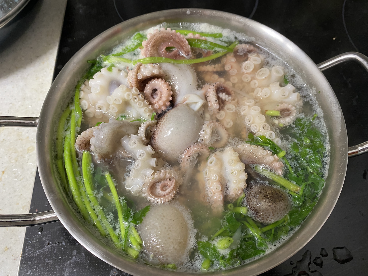 벌써 20분은 족히 지났지만 이쯤이면 알배기 쭈꾸미 전골? 샤브샤브? 쭈꾸미 연포탕 같은 호사스러운 음식을 먹는 시간으론 뭐. 훌~륭하게 해낸 것이지. 아직 뜨거운 쭈꾸미를 바쁘게 손질해서 머리 부분을 냄비에 넣고 한바탕 끓인다. 다 됐다. 바깥양반을 부르면서 마지막으로 쭈꾸미 다리를 다시 우수수 냄비에 담았다.