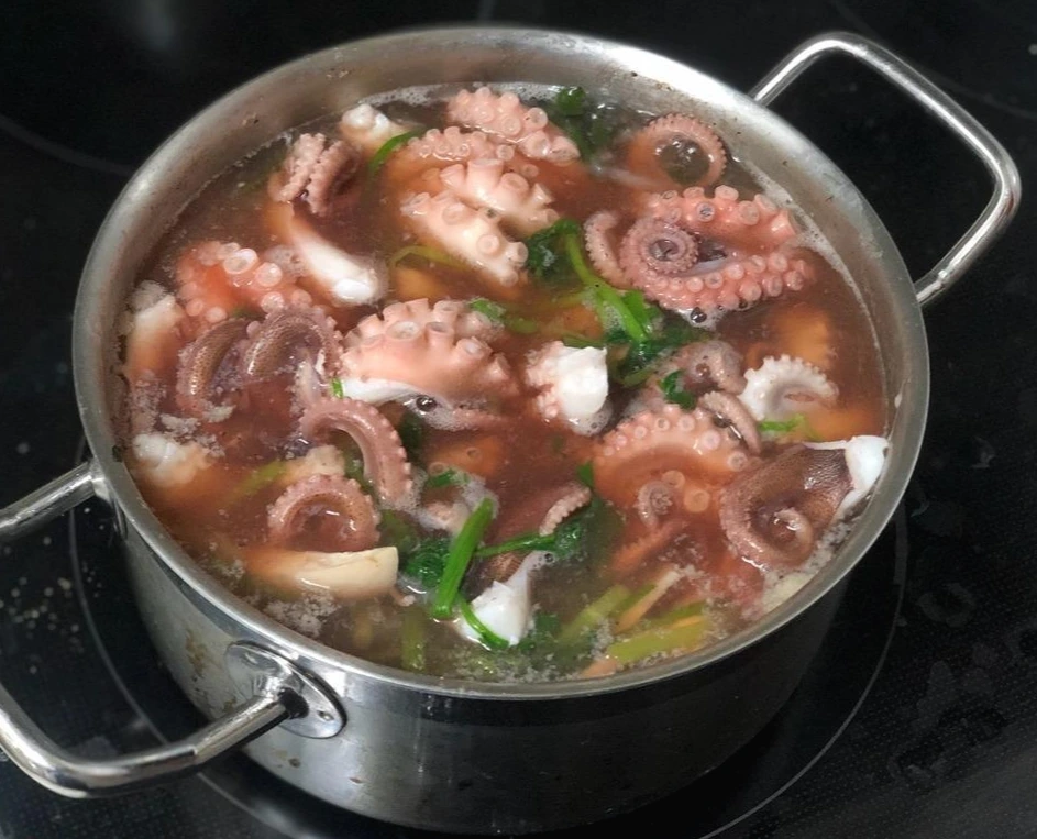 미나리를 후다닥 쓸어넣고, 불을 줄여 한소끔만 끓이면서 이번엔 쭈꾸미를 바로 꺼내어서 냄비에 하나 하나 담는다. 가장 중요한 시간이다. 쭈꾸미가 쫄아붙으면 안된다. 색만 변하면, 구해내야 한다.