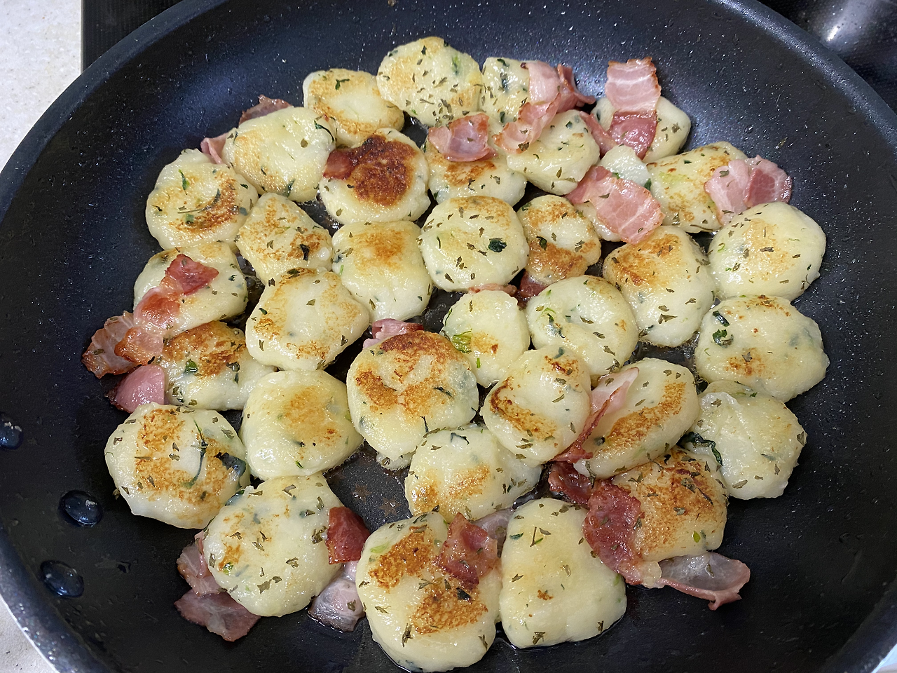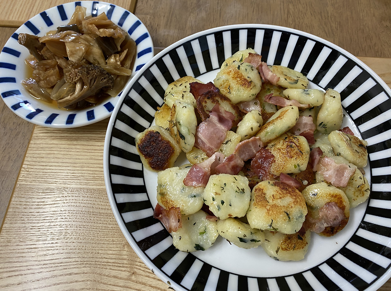 팬에 버터를 넉넉히 올리고 가열을 하며 베이컨을 후다닥 썰어넣었다. 열 알 정도의 삶아낸 뇨끼와, 삶지 않은 생 반죽을 손으로 뚝뚝 떼어서 모양을 잡고 올린다. 반죽이 간이 잘 되어 있어서 크림소스 같은