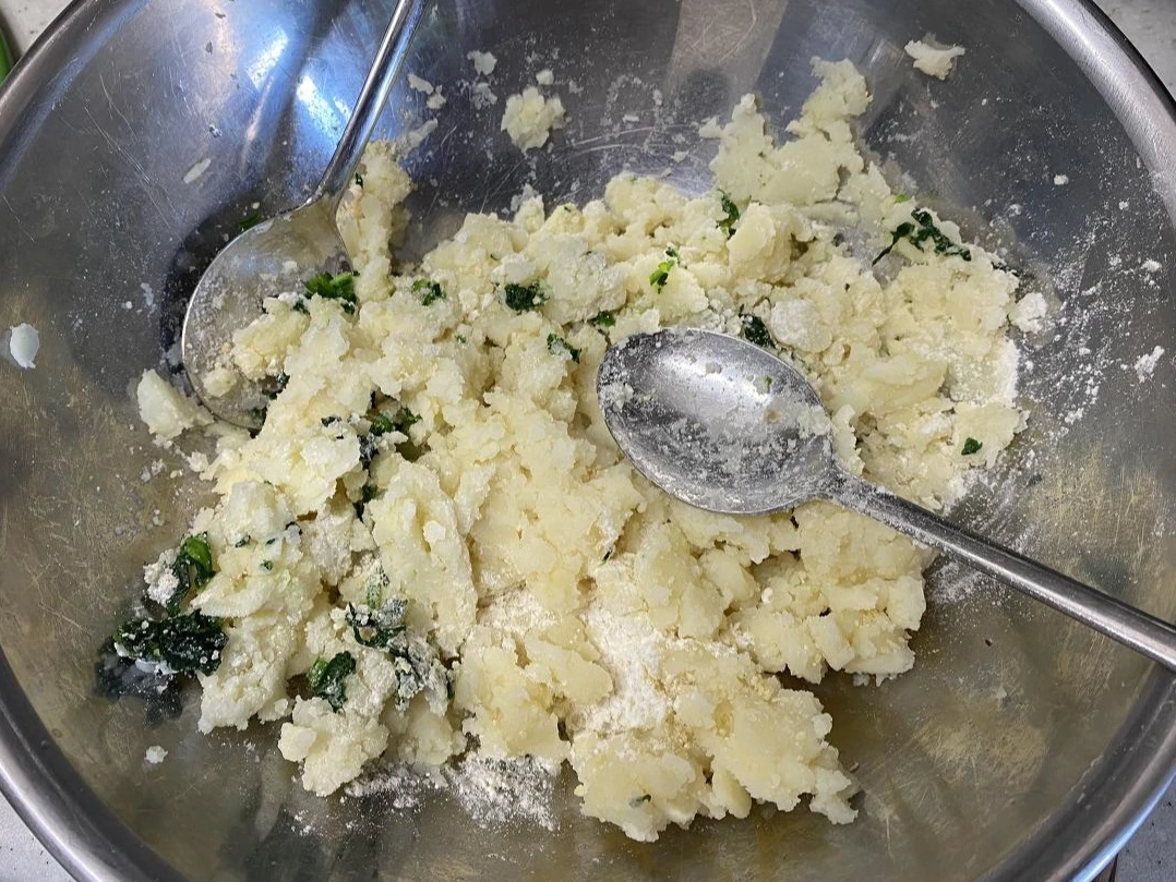 그래서 오늘의 뇨끼는 잘~ 마른 감자에, 시금치를 살짝 데쳐서 물기를 쫙, 짜고 다져서 넣었다. 파마산가루 약간, 소금 약간. 숟가락 두개를 들고 동시에 볼을 타다다다닥 치며 감자를 으깨고, 다시 버무리고 섞은 뒤 다시 타다다다닥.