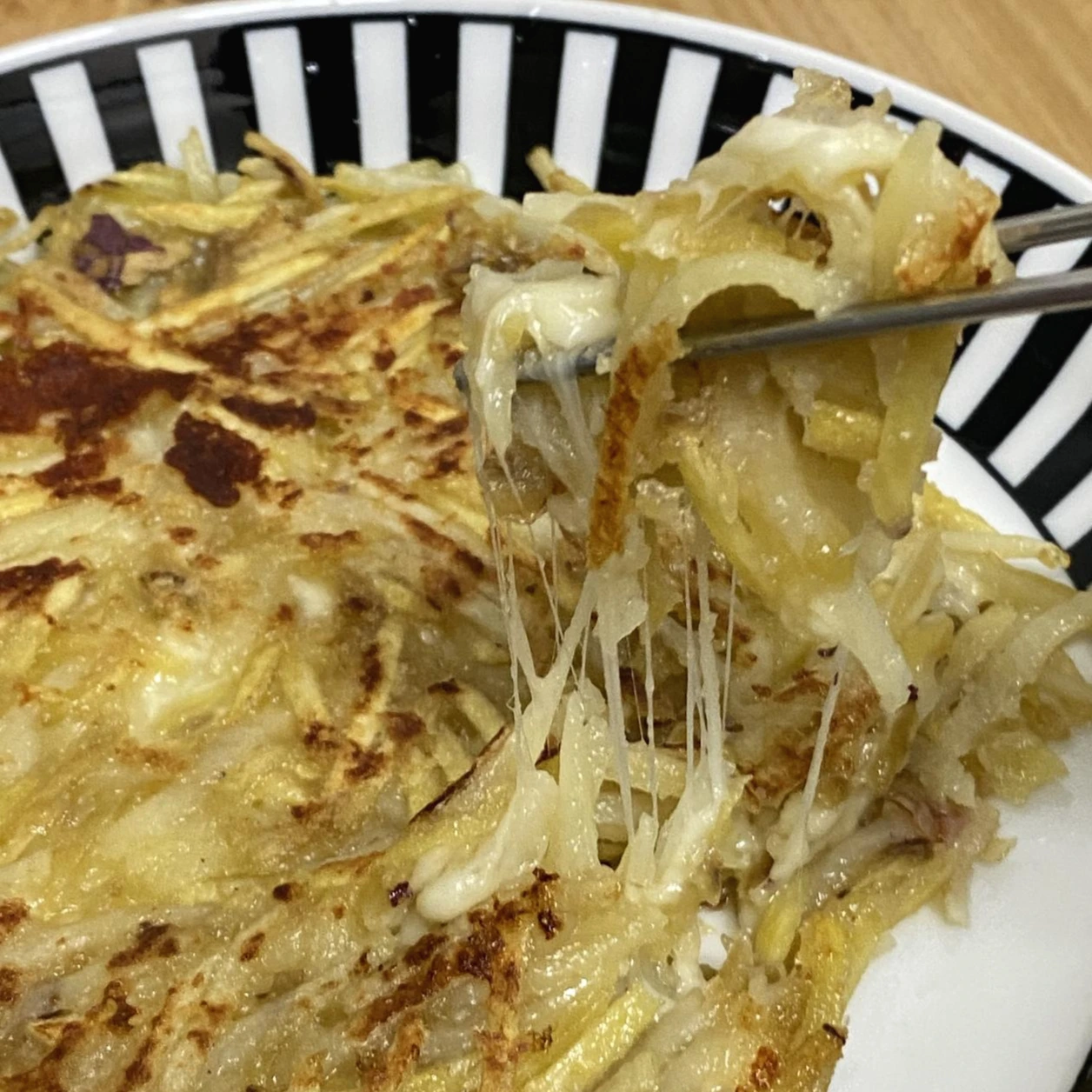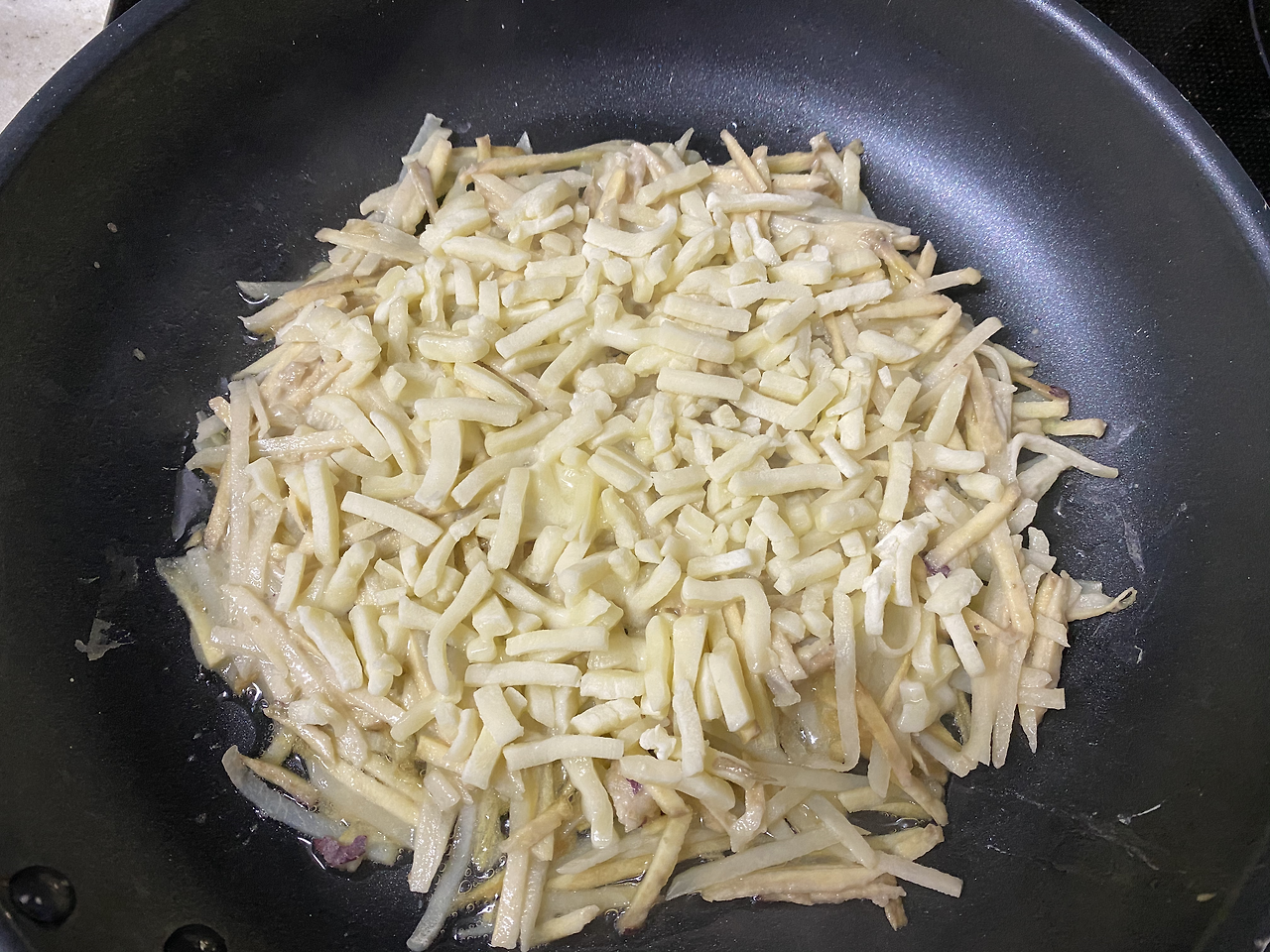 먼저 팬에 널찍이 감자와 고구마채를 깔고, 물론 그 전에 부침개가루를 소량 섞어서, 그리고 소분해뒀던 슈레드 치즈를 꺼내서 살살 뿌린다. 생각해보지 않았던 레시피인데 덕분에 양도 칼로리도 꽤 늘어날 것 같다. 맛은 있긴 할거야. 생각하며 치즈 위에 적당량의 감자고구마채를 넣고 살살 편다.
