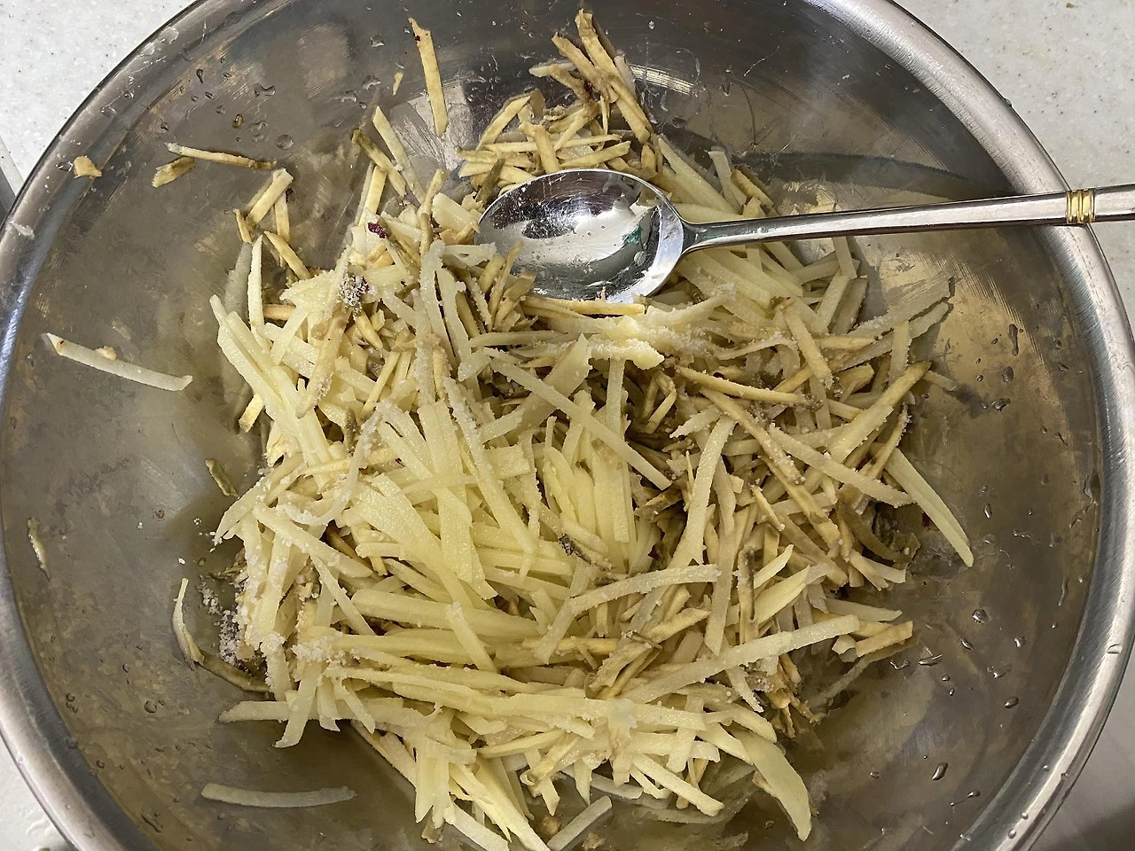 이왕이면 섞는 김에 두 재료의 맛을 제대로 살리기 위해 갈기보다는 채써는 길을 택했다. 채칼에 고구마를 먼저 채썰고, 이어서 감자를 채썬다. 고구마의 뻑뻑함이 채써는 손을 다치게 할까 아슬아슬하다. 항상 부침개를 준비하다보면 느끼는 것인데, 처음에 재료를 씻을 때에 비해서 손질을 하면 굉장히 양이 많다. 감자 두 알, 고구마 두개면 그냥 간식으로 앙 앙 먹을 분량인데, 이걸 부침개를 하려고 이렇게 버무려놓으면...말도 안될 양이다. 야 이거 꽤 살찌겠네 싶은.