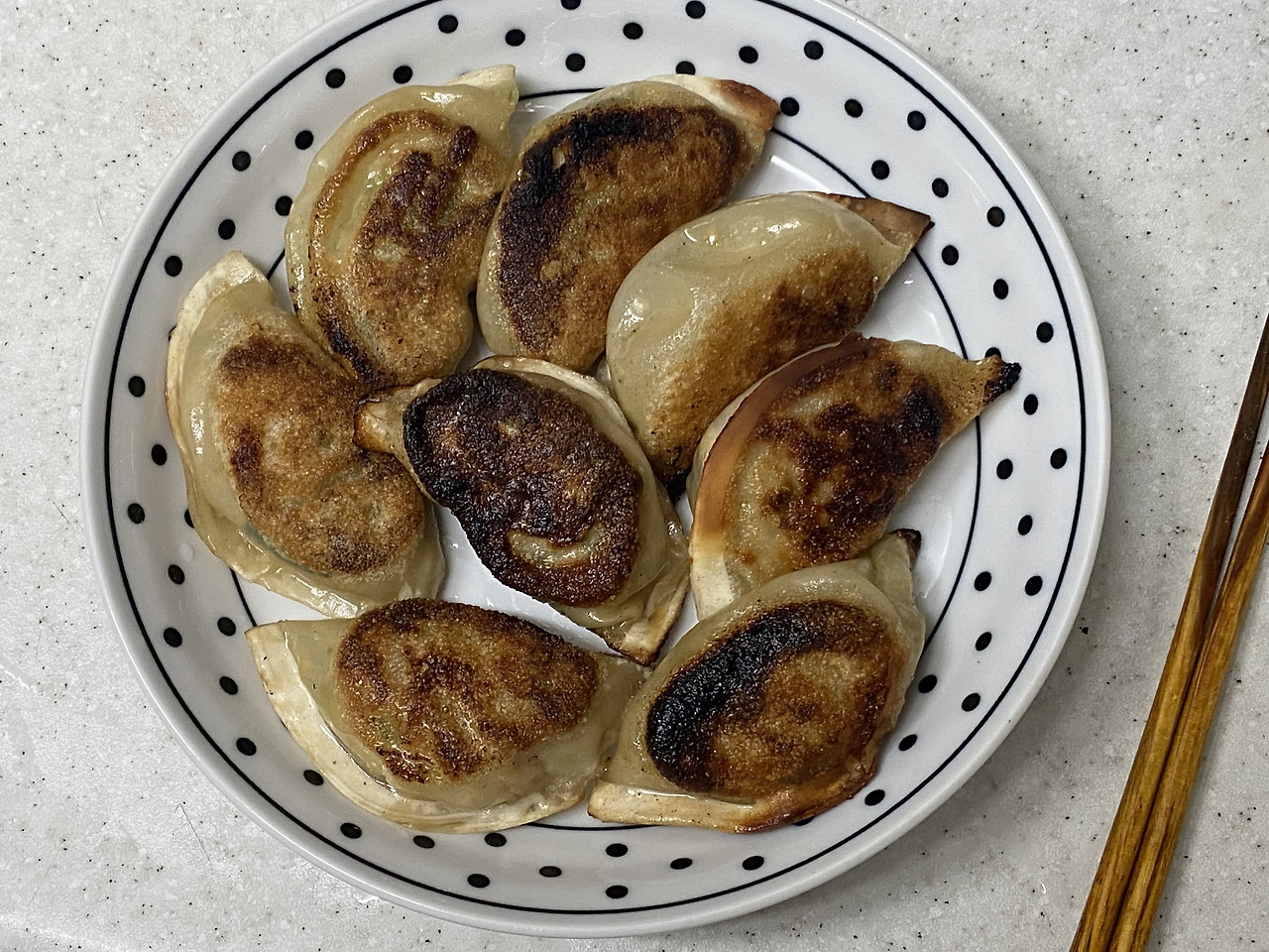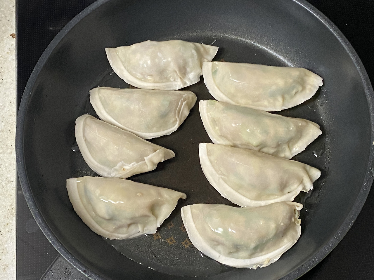 그런데 그 와중에 만두속이 때깔이 참 곱다. 간장에 참기름, 마늘소금으로 대략 간을 했다. 그리고 빚어낸 만두들은 바로바로 후라이팬에 올린다. 기름은 미리 둘러두었다. 뚜껑을 덮고...양지를 꺼낸다. 그리고 잔뜩 어질러진 주방을 치우며 설거지를 한다.