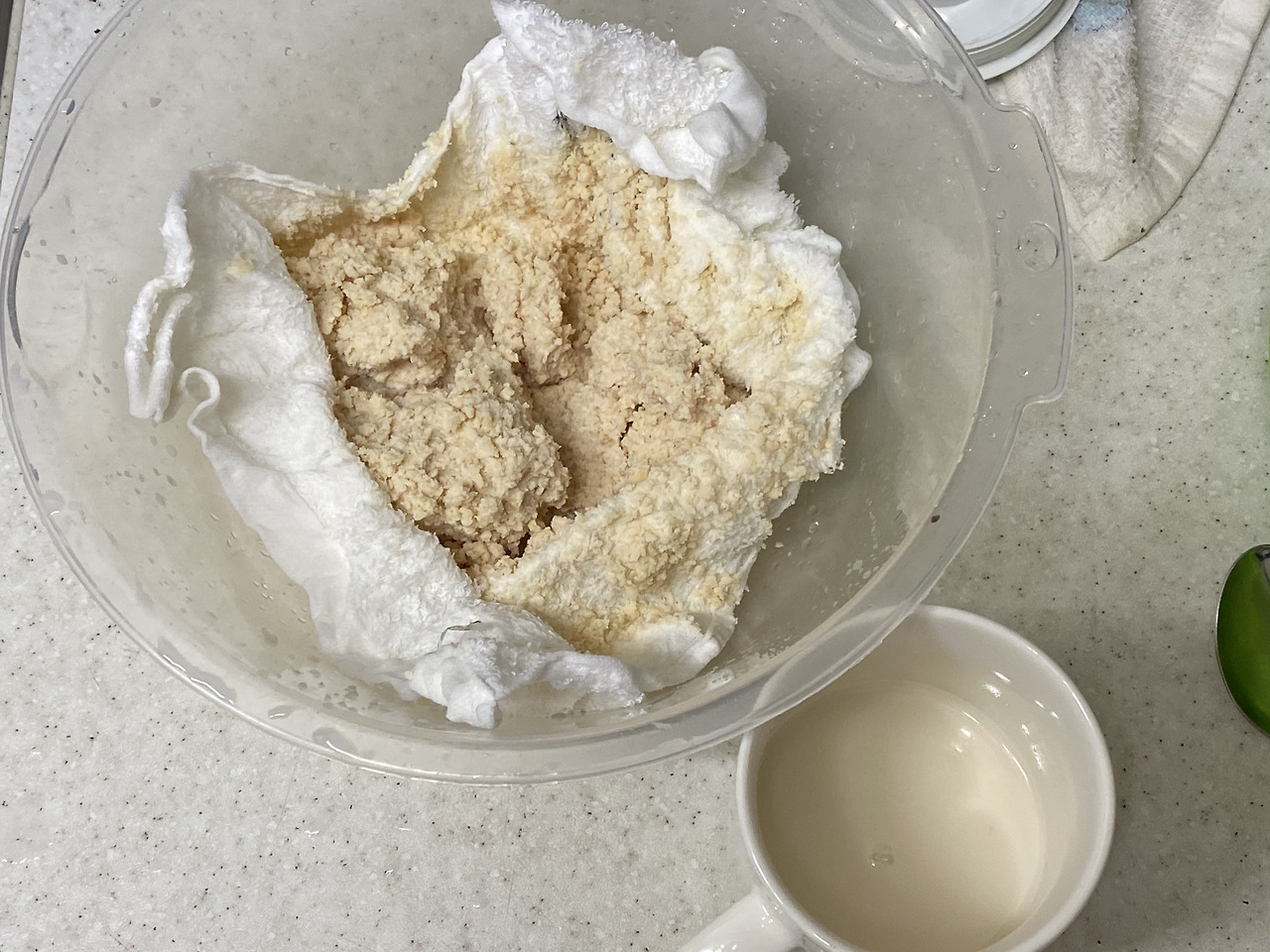 왜 성공인거지? 왜? 왜 나 안망했지? 멀끔한 비지가 나와버렸다. 작은 믹서기라 제대로 갈아지지 않아서, 절구에 빻은 정도의 입자가 나왔지만 비지를 만들었다. 만들어버린 것 같다. 새로 꺼낸 순면 100% 면포에 두유를 짜내고 난 비지를 탈탈 털어서 볼에 담고 바깥양반을 불렀다.