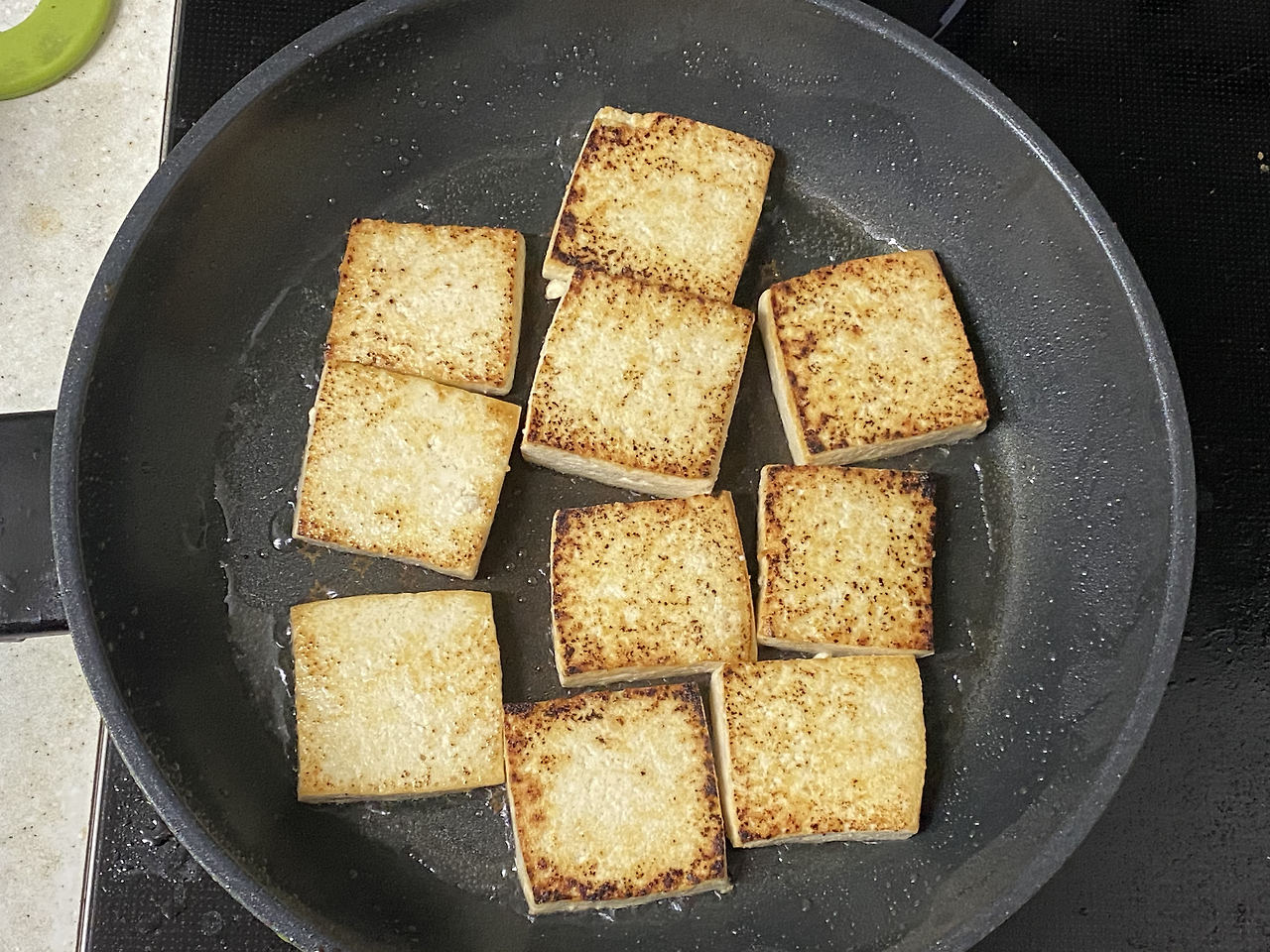 크게 잘라놓은 두부들을 유리통에 정리해서 차근히 담아두고, 이번에는 지우개 정도 크기로 두부를 한번 더 잘랐다. 후라이팬에 삼합을 그득하게 담아야 하니 넓게 조각을 내서는 모양이 잘 안잡힐 것 같다. 이때쯤 TV에서는 <놀면뭐하니>가 방송을 시작했다. TV에서도 셋, 내 후라이팬에서도 세상 맛있는 음식이 셋이 모여서 삼합이 되니 이치가 재미있다. 뭐든지 합치고 섞여야 맛이지.