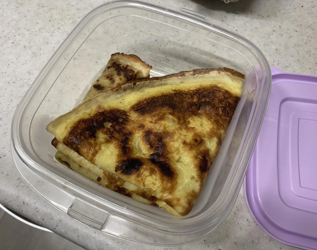 이왕이면 집에서 브런치로 먹었다면, 아 마침 내일이 주말이구나, 그럼 더 호화스럽게 속재료를 꾸밀 수 있는 요리일 터지만 바깥양반 도시락이니 오늘은 이정도면 되었다. 랍스터 페이스트로 단촐하게 만든 두장의 블린을 차곡차곡 통에 담았다. 그리고 나는 마침 싱크대 위에, 치우지 않고 두었던 비닐봉지를 발견해 펴서 그 안에 통을 넣었다.