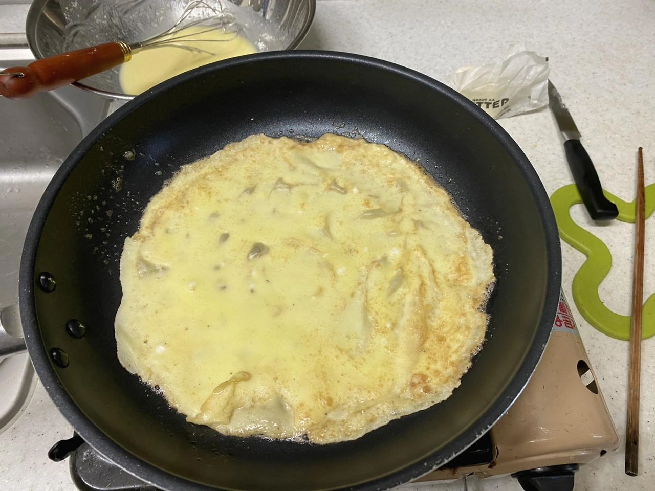 이래서는 계란지단 같은걸. 일단 아침밥을 차리면서 잠깐 지켜보다가 뒤집개를 꺼내서 뒤집어보려고 하는데, 어 잘 되지 않는다. 끝부분이 찢어져버렸다.