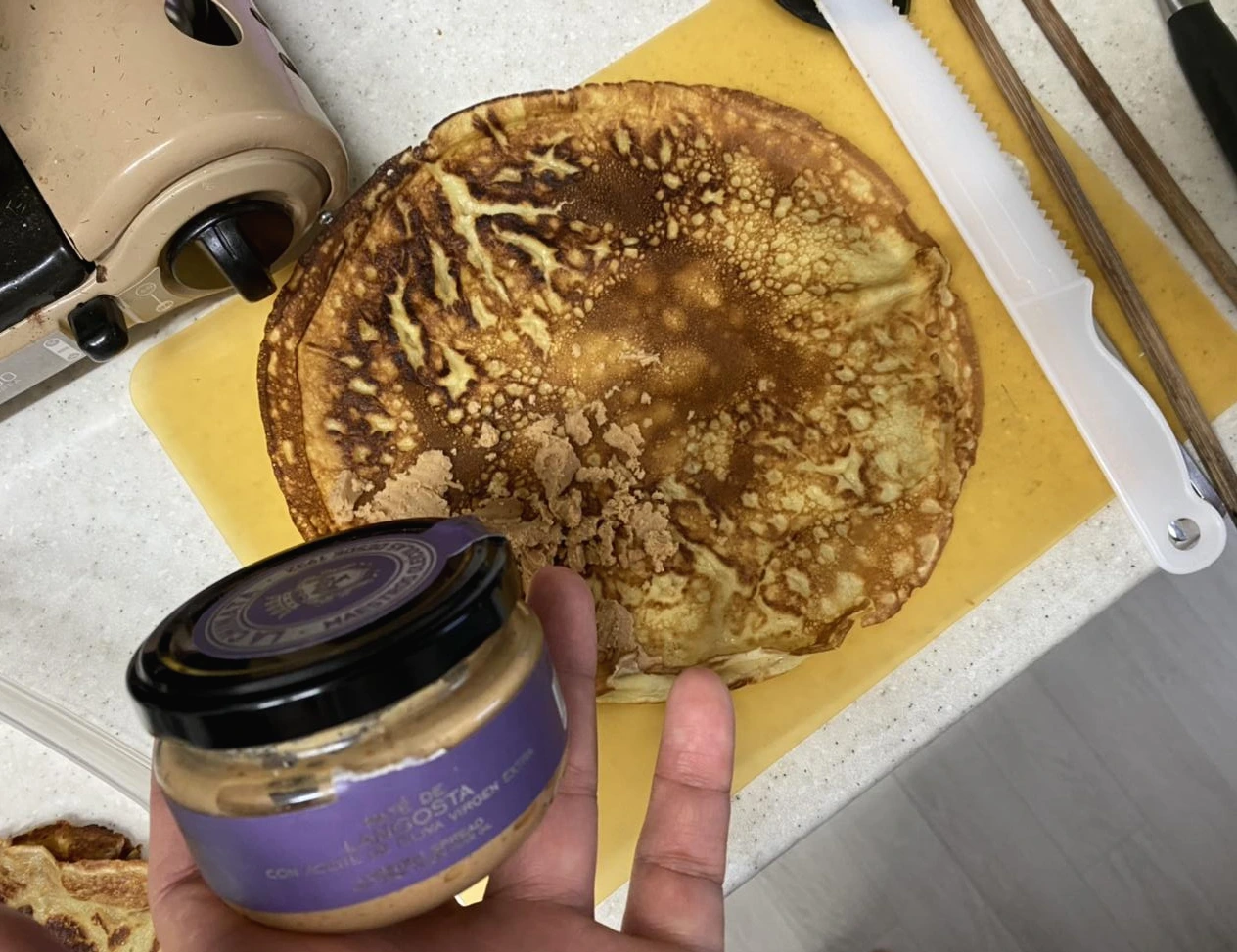 속재료로 쓰기에 딱 좋은 게 마침 냉장고에서 발견되었다. 바깥양반이 사왔거나 아니면 바깥양반이 친구에게서 선물로 받았을거인데 이거시 뭔고 하니 랍...스터 페이스트? 토스트에 한번 발라먹어봤는데 좀 짜고 랍스터내음이 난다. 넉넉히 톡톡 한쪽면에 모아서 뿌려준 뒤에 반을 접고 또 반을 접어 완성. 금새 두장이 만들어졌다.