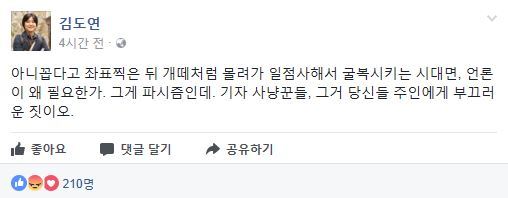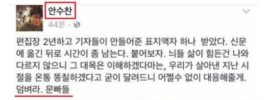 그런데 안수찬의 "덤벼라 문빠들"이란 발언은 그러한 독자들의 집단적 문제제기가, 단지 그 수가 폭발적으로 증가했다는 사실만을 전체 맥락에서 잘라내와 특정 정치집단의 비이성적 행동으로 규정하고, 그를 통해 문제제기 자체를 배제하려는 시도였던 것이다. 이는 "불특정 다수"를 전제하는 "매스미디어"로서 스스로를 부정하는, 언론으로서는 최악의 행태다.