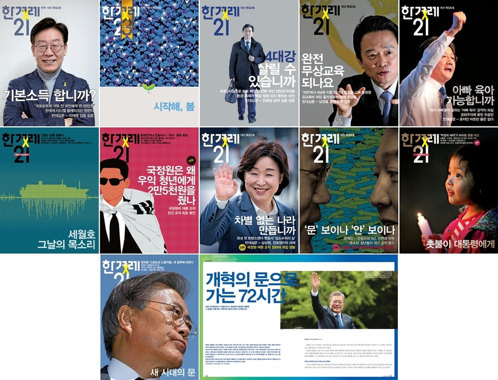 <사진1> 한겨레21 1163호의 편사성 논란 해명기사 자료. 한겨레는 대선주자들을 순차적으로 표지모델로 게재하기로 기획했으며, 마찬가지로 안철수 당시 후보 역시 문재인 후보와 같이 표지모델로 죽 배치되지 않았다고 해명했으나, 문재인 후보와 안철수 후보가 마주보고 있는 표지 이미지는 안철수 후보가 주장하고 있던 양자구도에 대한 밀어주기 의혹이 있다.