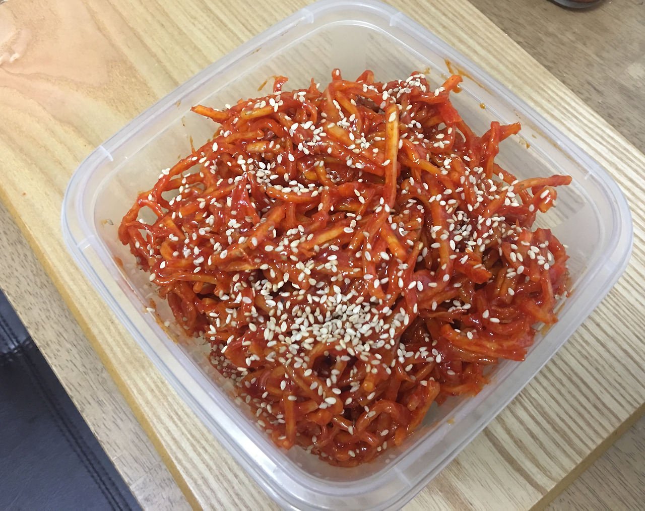 몇번 비비다 보니, 눈대중으로 양을 맞춘 것이라 마요네즈와 고추장이 부족하다. 다시 마요네즈와 고추장을 넣었다. 조심해야 한다. 마요네즈와 고추장의 밀도가 달라, 잘못하면 고추장이 충분히 섞여들지 못하고 겉돌다가 덩어리 째로 진미채에 들러붙을 수 있다. 큰일이...날까? 그러고보니. 그냥 고추장에 찍어먹기도 하긴 하니까. 멸치도 그렇고 말이지. 어쨌든, 신중하게 몇번이나 볼을 닥닥 흔들어대며 진미채를 마저 무쳤다. 볶지 않아 손도 덜 가고 마요네즈 덕에 부드러운 맛이다. 반찬통에 무친 것을 담은 뒤, 마무리로 깨소금을 꼼꼼하게 뿌려 올린다.