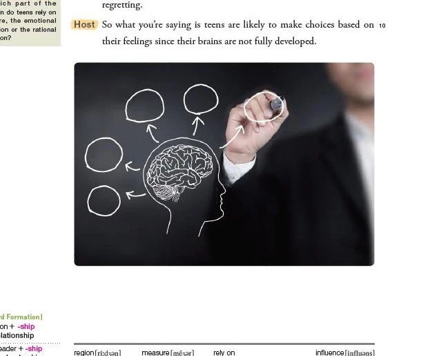 진행자: 그렇다면 박사님 말씀은 십 대들은 뇌가 완전히 발달되지 않아서 감정에 기반한 선택들을 하는 경향이 있다는 것이군요.