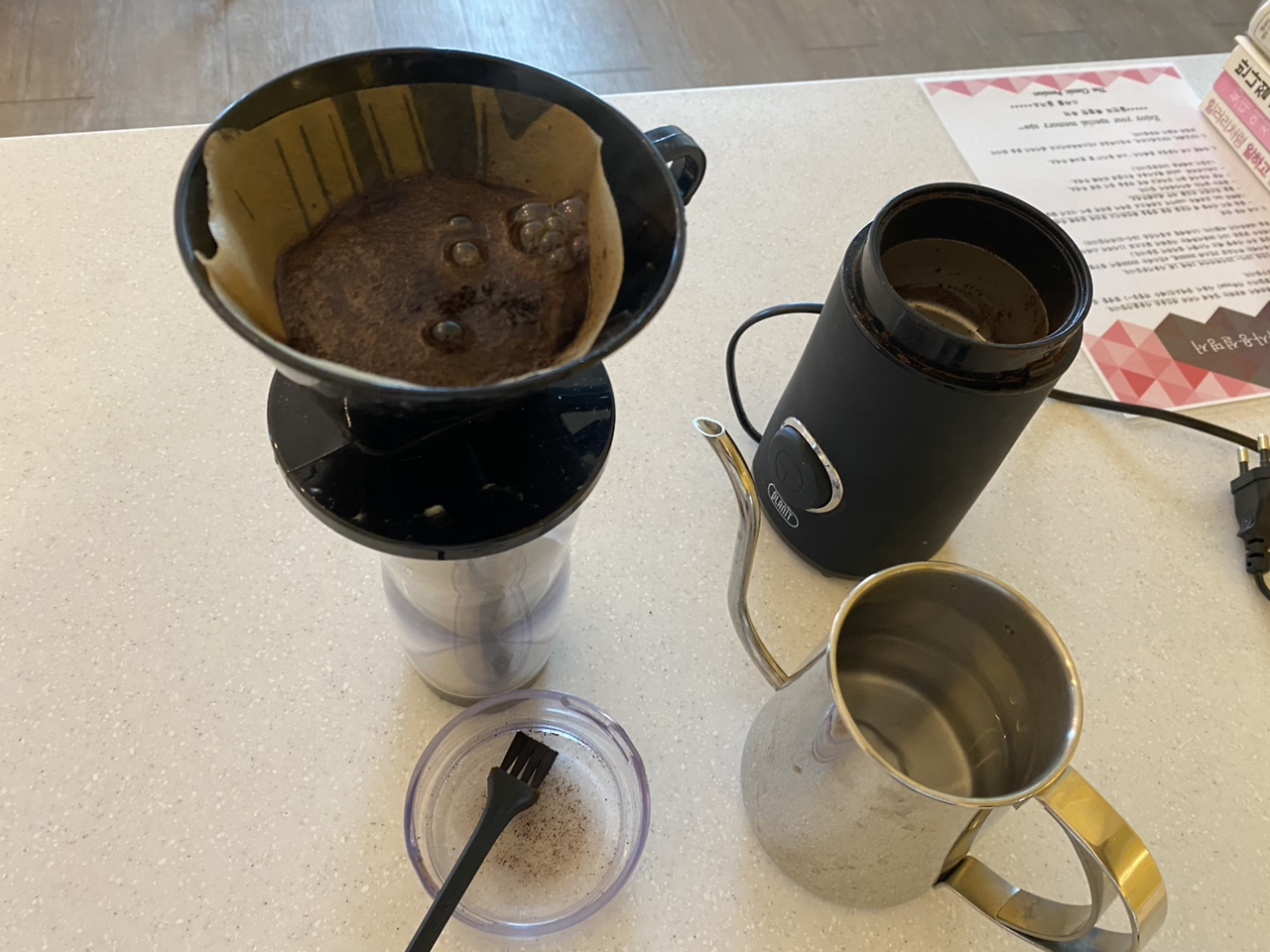9월에 찾은 양평의 민박도 그런 케이스였다. 가까운 슈퍼가 걸어서 10분이 걸리는, 농촌에 딱 붙은 한적한 민박집에 가까운 펜션이었다. 숙소를 내가 정했기 때문에 주변에 커피 따위를 사먹을 곳이 없다는 것을 너무나 잘 알고 있었고 그런 것보단- 그냥 단순하고 심플하게 "가져가면 되지 뭐."라는 생각을 하고야 만 것. 마침 추석도 붙어있겠다 우리는 먼저 집에 가서 명절 식사를 마친 뒤 그라인더로 윙윙 콩을 갈아 명절음식 차리신다고 난장판이 되어 있는 주방 구석에서 커피를 내려 엄마와 누나에게 대접했다. 엄마나 누나의 바운더리에서 어디서 사 마시기 어려운 기묘한 맛의 커피에 퍽 즐거워하셔 나도 기뻤다.