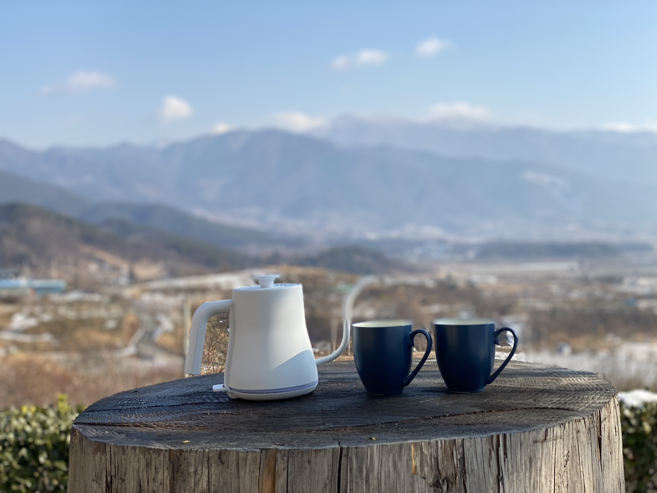 바깥양반과 나는 지리산의 설경을 보며 나란히 앉아 각자 푸념을 토해냈다. 새해 첫날을 보내기 위해 내려온 여행, 바깥양반은 사회적 거리두기와 사회와 거리두기를 혼동한듯한 산 중턱의 독채펜션에 방을 잡았고 그곳은 정말로 아무 생각 없이 쉬고 가기에 좋은 곳이었지만...차를 한잔 하지 않기엔 너무나 아름다운 풍경이다. 나는 커피가 땡겼고 바깥양반은 핫코초를 원하고 있었다.