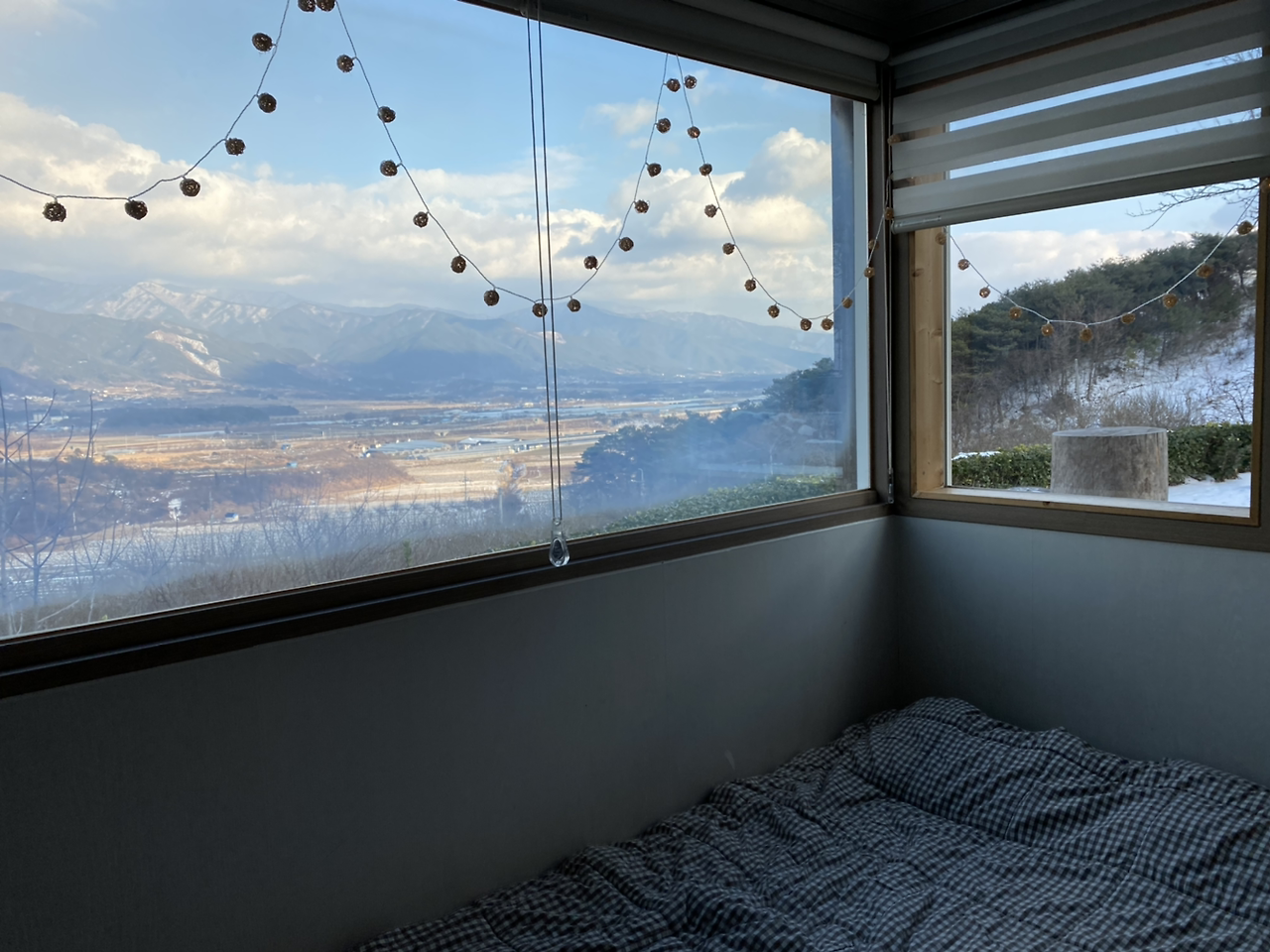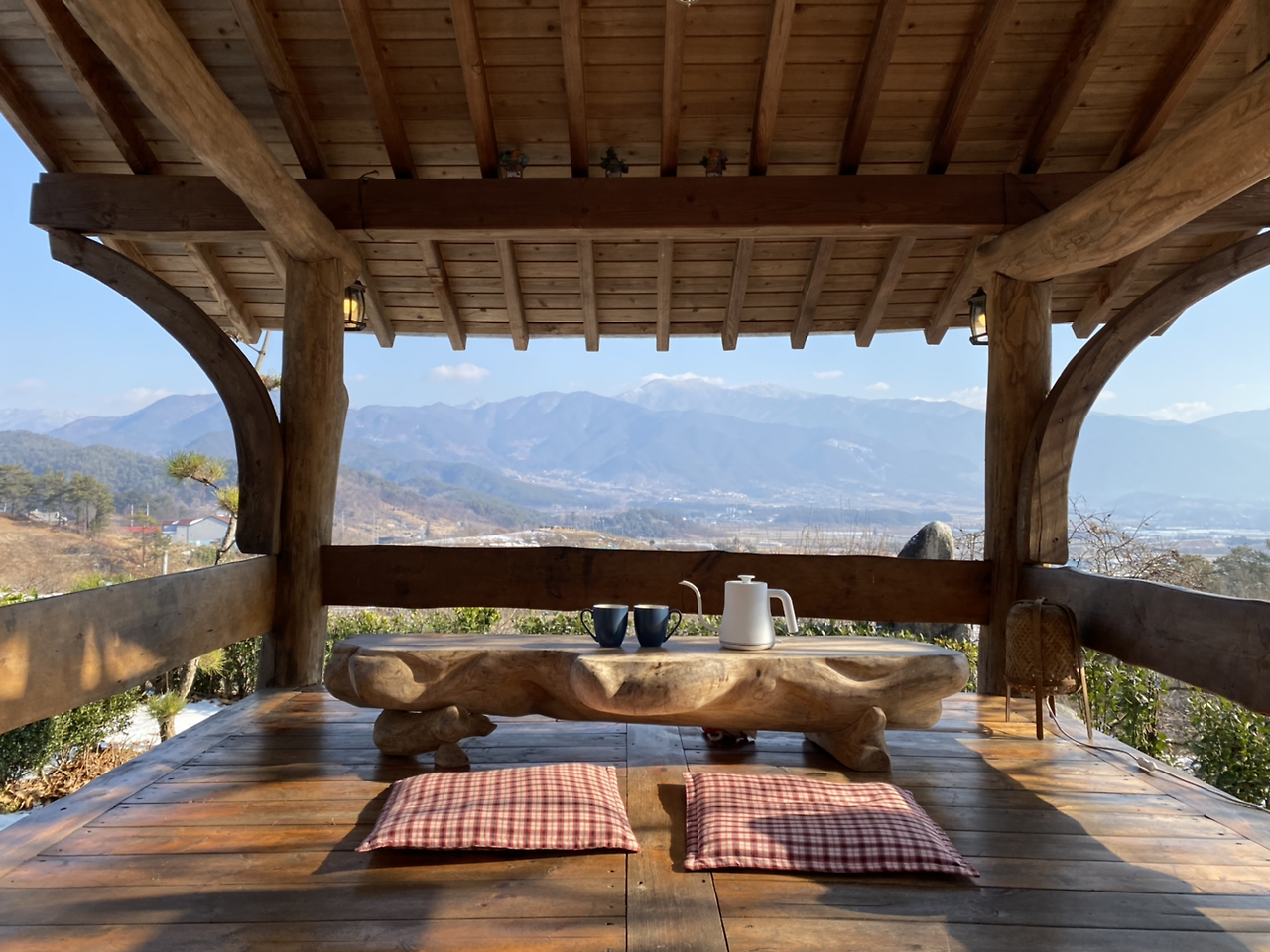 우리는 아침에 김밥과 슈크림빵에 마들렌 등, 집콕 휴일을 보내기 위해 바리바리 사온 간식들로 아침을 떼우고 나서 씻기 시작했다. 뜨거운 물을 가득 머리에 부으며 여전히 커피를 그리워했지만 지리산 설경을 보며 수제고구마차를 마시는 일도 즐겁기만 할 것 같았다. 짐을 정리하고 설거지를 마쳤다. 그리고 바깥양반을 재촉하며 미리 포트에 물을 팔팔 끓였다. 원래 바깥양반은 뜨거운 것을 잘 마시지 못해서 중간 정도 온도로 차를 내어주는데, 밖은 춥다. 그리고 산과 설경을 감상할 시간은 길다. 완벽하게 준비를 마치길 기다려서 우리는 마지막으로 펜션 앞마당 정자에 앉았다.