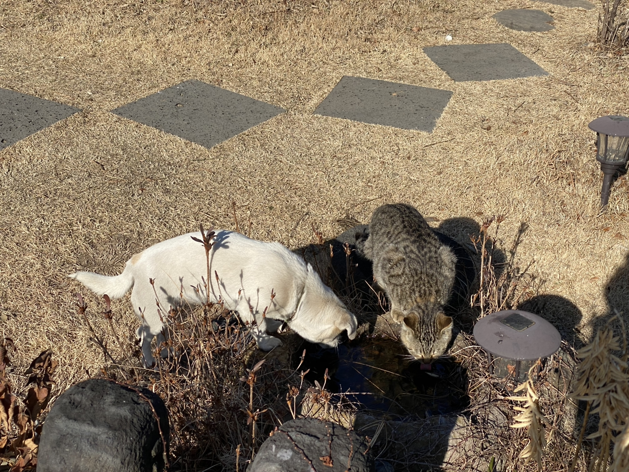 사장님이 작은 가건물의 문을 열자 안에서는 회색빛 줄무늬 고양이와 두마리의 강아지가 득달같이 뛰어나왔다. 손님을 반긴 것은 아니고 정원 한켠의 돌그릇에 담겨있는 물을 홀짝이며 마신다. 이채로운 광경에 나는 폰으로 연신 두마리를 찍는데, 벌컥벌컥 물을 마신 강아지가 먼저 자리를 뜨고서도 홀짝홀짝 한참이나 요녀석은 꼬리를 살랑살랑 흔들며 물을 마신다. 나는 확신을 품고 고양이의 등을 쓰다듬었다. 여전히 살랑, 또 살랑. 엉덩이까지 토닥여준 뒤에 그 사이를 못참고 "오빠!"하며 나를 부르는 바깥양반에게 가 차를 골랐다. 내 선택은 석류차.