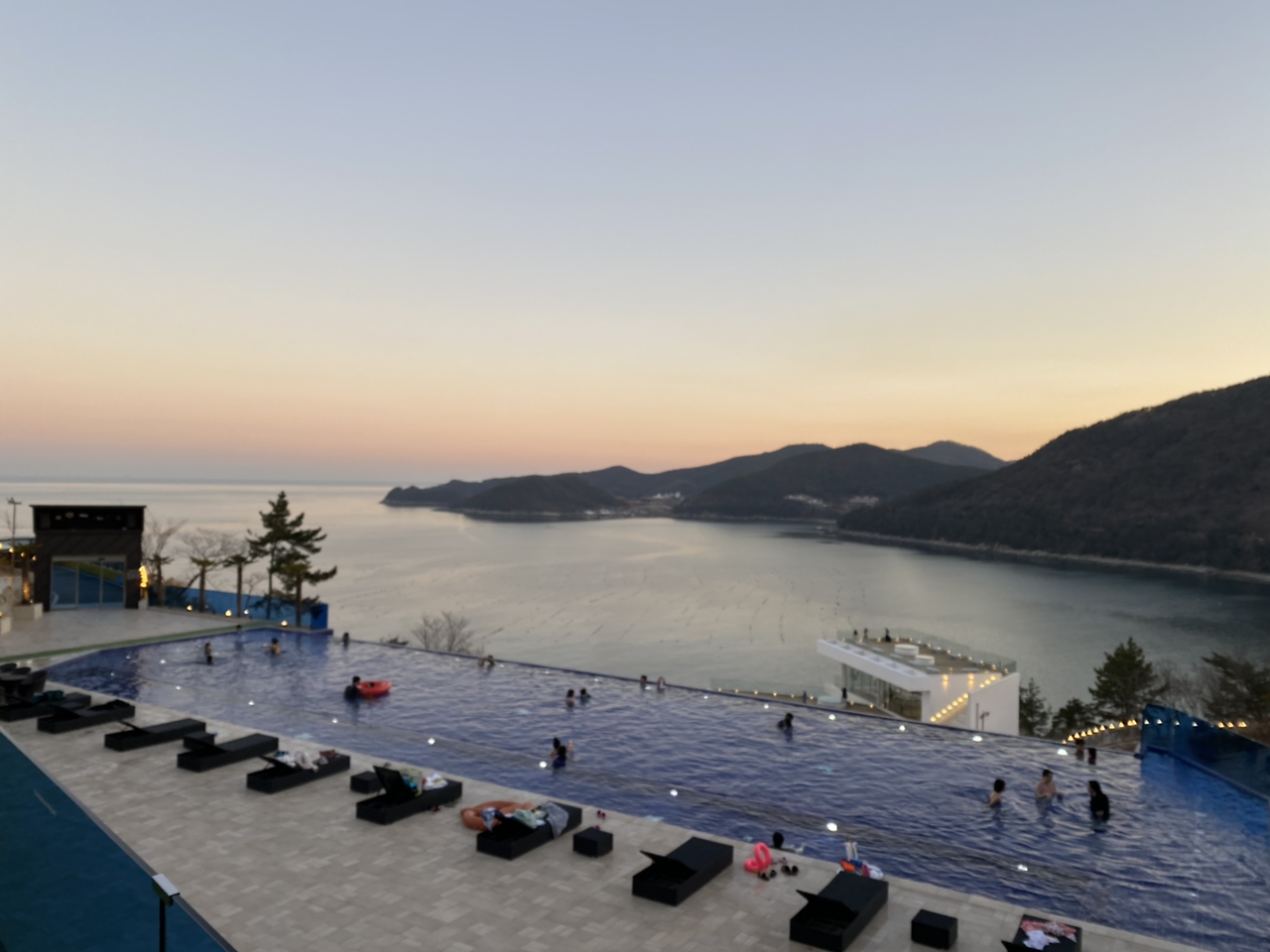 한겨울임에도 불구하고 온수풀인지 여러 사람들이 수영을 즐기고 있었다. 코로나 때문에 괜찮을까? 싶지만 이런 풍광을 보고 몸을 담구고 싶은 마음은 매한가지일듯했다. 우리는 리조트를 두루 구경하며 나중에 코로나가 종식되면 이곳에 꼭 다시 오기로 약속을 하고, 사천에서 여수를 건너오는 사이에 어느덧 저물어가는 해를 기다렸다. 노을을 본 뒤에, 저녁을 먹기로, 했는데,