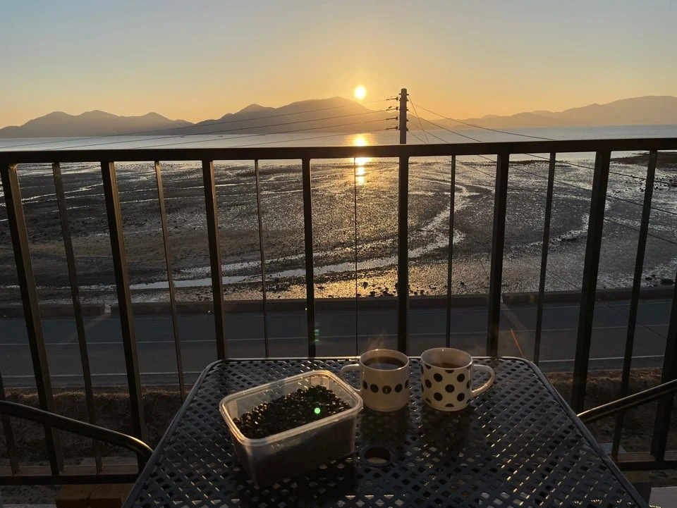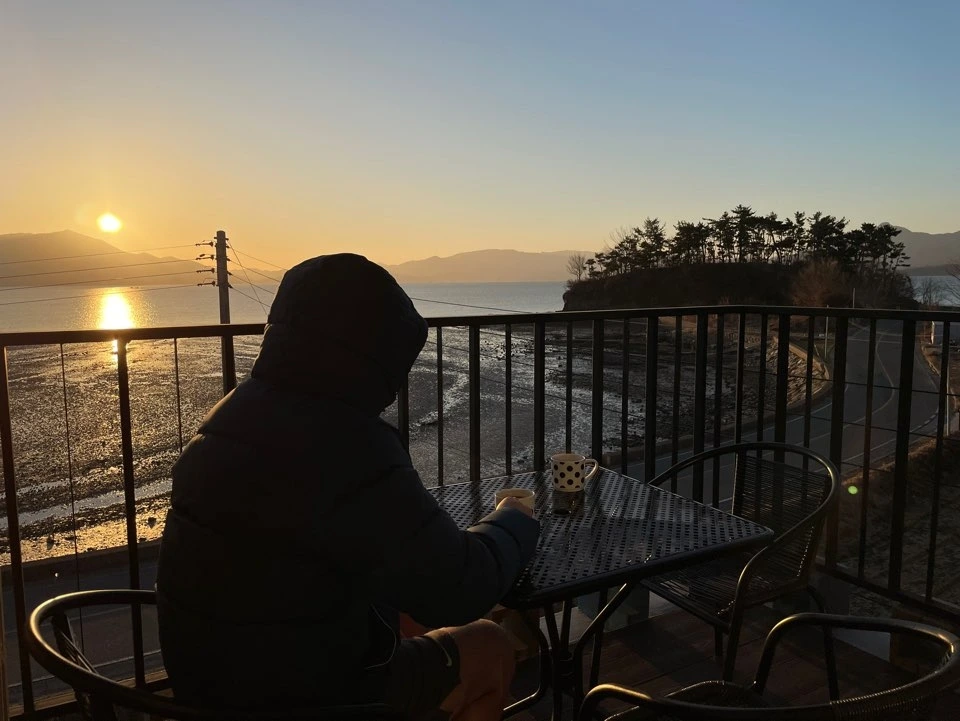 세번째 밤을 보낸 남해 설천면의 숙소는 꽤나 멋들어진 일출을 보여주었다. 일출이 아름답다는 것은 아침도 쾌청하다는 것이다. 아침 일곱시를 조금 넘겨 나는 커튼을 활짝 얼였고, 바깥양반은 "오빠 너무 멋있다!"라며 눈을 감은채로 폰을 더듬어 연신 일출을 찍기 시작했다. 우두커니 침대에 같이 앉아서 햇빛이 얼어붙어있던 하늘을 부수어내는 것을 보다가, 나는 작심을 하고 캐리어에서 커피와 그라인더, 그리고 드리퍼를 꺼냈다. 아차. 드립용 포트를, 안가져왔다.