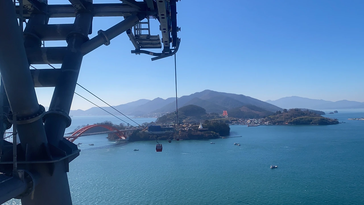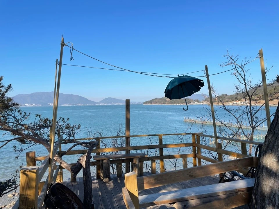 육지에서의 여행코스와 숙소를 모두 바깥양반이 정했다. 그러다보니 그날 그날의 날씨와 우리의 운세에 따라서 바뀌는 여행일정을 숙소가 충분히 담보하지 못한다. 하동으로 넘어가는 길목에 자리한 숙소에서 다시 사천으로 넘어가 케이블카를 타기로 했다. 날씨가 너무, 너무 좋았기 때문이다. 어제의 먹구름과 삭풍은 온데간데 없고 베란다에서 커피 한잔을 모두 비울만큼 날씨는 차분해져 있었다. 남해까지 또 언제 올지 모르는데 국내 최장이라는 사천케이블카를 놓칠 수 없지. 게다가 겨울이다. 풀과 꽃을 즐기기보단 멀리서 멀리서 푸른하늘과 옥빛 바다를 즐기는 게 최고다.