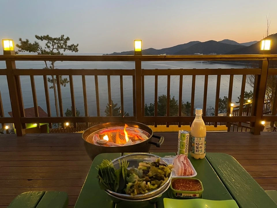 이렇게 또 계획을 순식간에 바꿨다. 오늘의 일정은 온통 즉석에서 이루어진 것들 뿐이다. 게장백반은 내일로 미루고 야외에서 고기를 굽기로 했다. 해가 더 넘어가면 안되겠지. 우린 빨리 움직이기 시작했다. 근처의 마트로 차를 몰아 신속하게 고기와 야채를 사고, 득달같이 바베큐를 요청해 고기를 굽기 시작했다. 그래서 오늘의 저녁은- 동켠 바다로 스며드는 노을과, 제법 추운 바람과, 그 바람을 상쇄시켜주는 달갑지 않은 숯의 연기와, 절반도 마시지 못한 막걸리로 마무리되었다. 아침 일곱시부터 긴 긴 하루를 보냈다. 그리고 일찍 쉬어 두어야 한다.