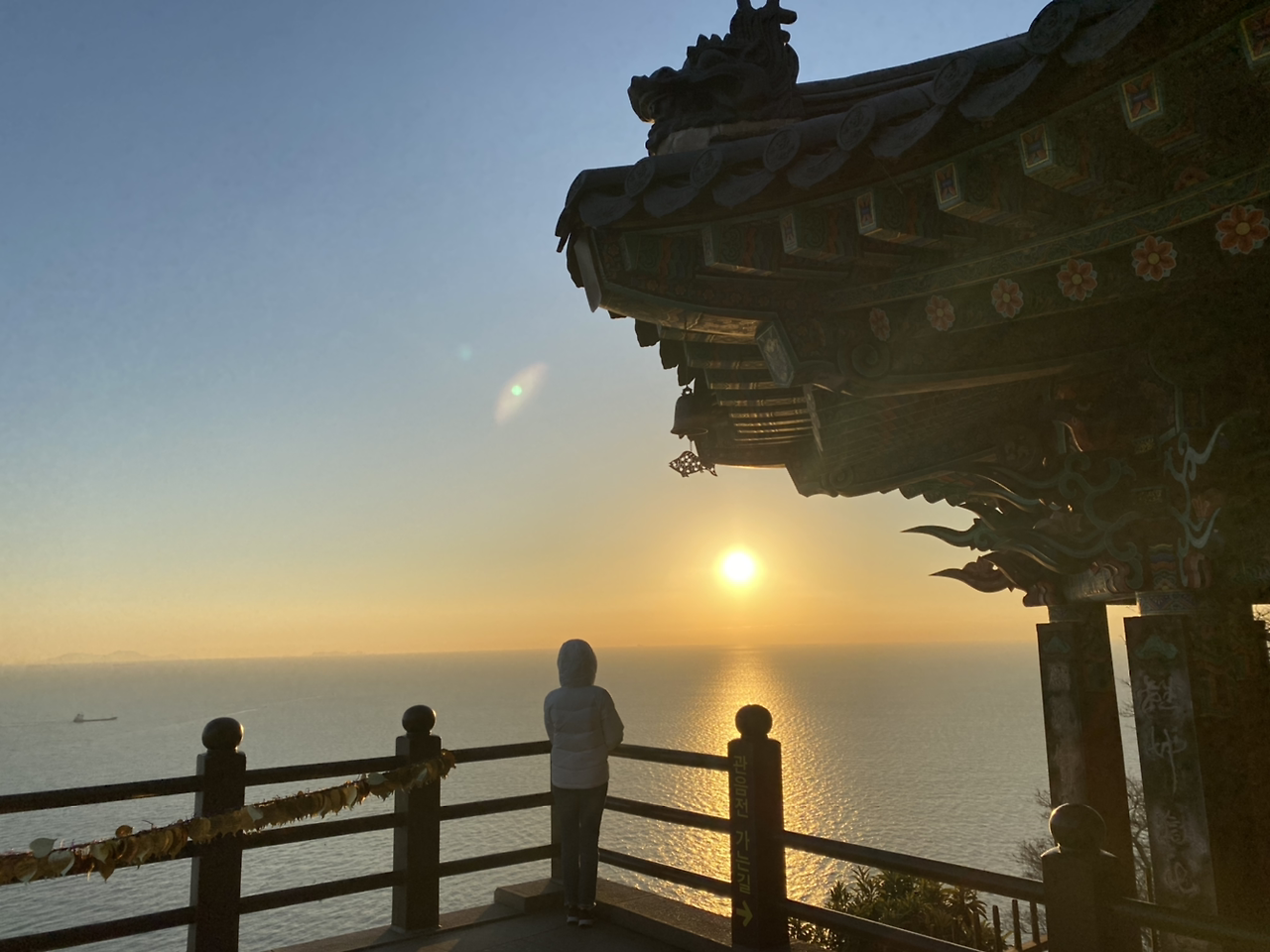 그렇게 미친듯이 계단을 올라 대웅전 앞에 도착해, 나는 완전히 바닥에 엉덩이를 깔고 퍼져버렸다. 원래는 7시쯤부터는 나와서 붉게 달아오르는 여명부터 봤어야 하는데. 오늘처럼 일출이 아름다운 날에 이미 지평선에서 도동실 떠올라버린
