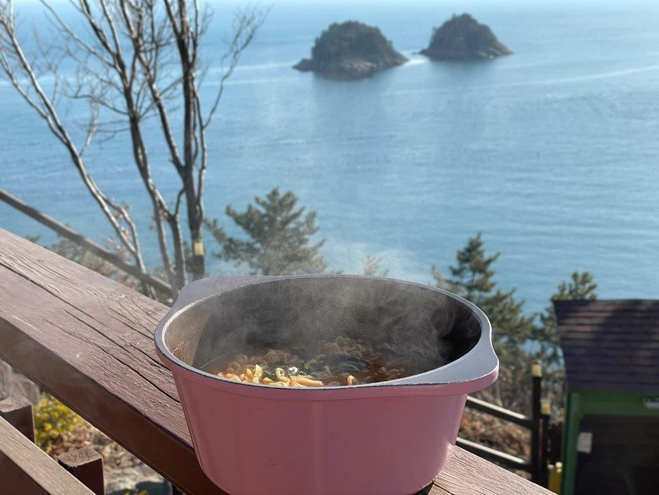 숙소로 돌아와서는 아침으로 라면을 먹기로 했다. 향일암이 돌산도 끝이니 시간은 벌써 9시. 편의점이 숙소를 지나 차로 5분 정도 더 가면 있는데 그걸 굳이 또 차로 다녀오기가 구차해 걸어서 다녀왔다. 그러고 나니 왕복 30분. 아침부터 운동을 화끈하게 했다. 바깥양반 주문대로 아이스크림 콘까지 사왔는데, 염분 범벅인 라면에 설탕범벅인 아이스크림까지 먹어도 조금도 후회나 미련이 남지 않을만한 스타트다. 그것을 향일암 못지 않은 바다뷰를 보며 야외에서 먹었다. 괜찮은, 하루의 시작이랄까. 제주도에서도 매일 이렇게 하루하루 부지런하게 보내면 좋을 것 같지만 도착하는 다음날부터 4,5일은 비 예보다.