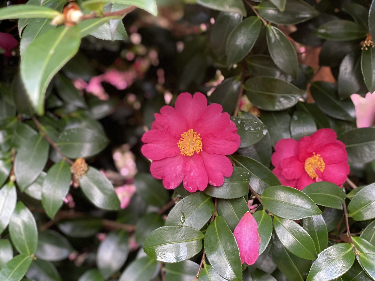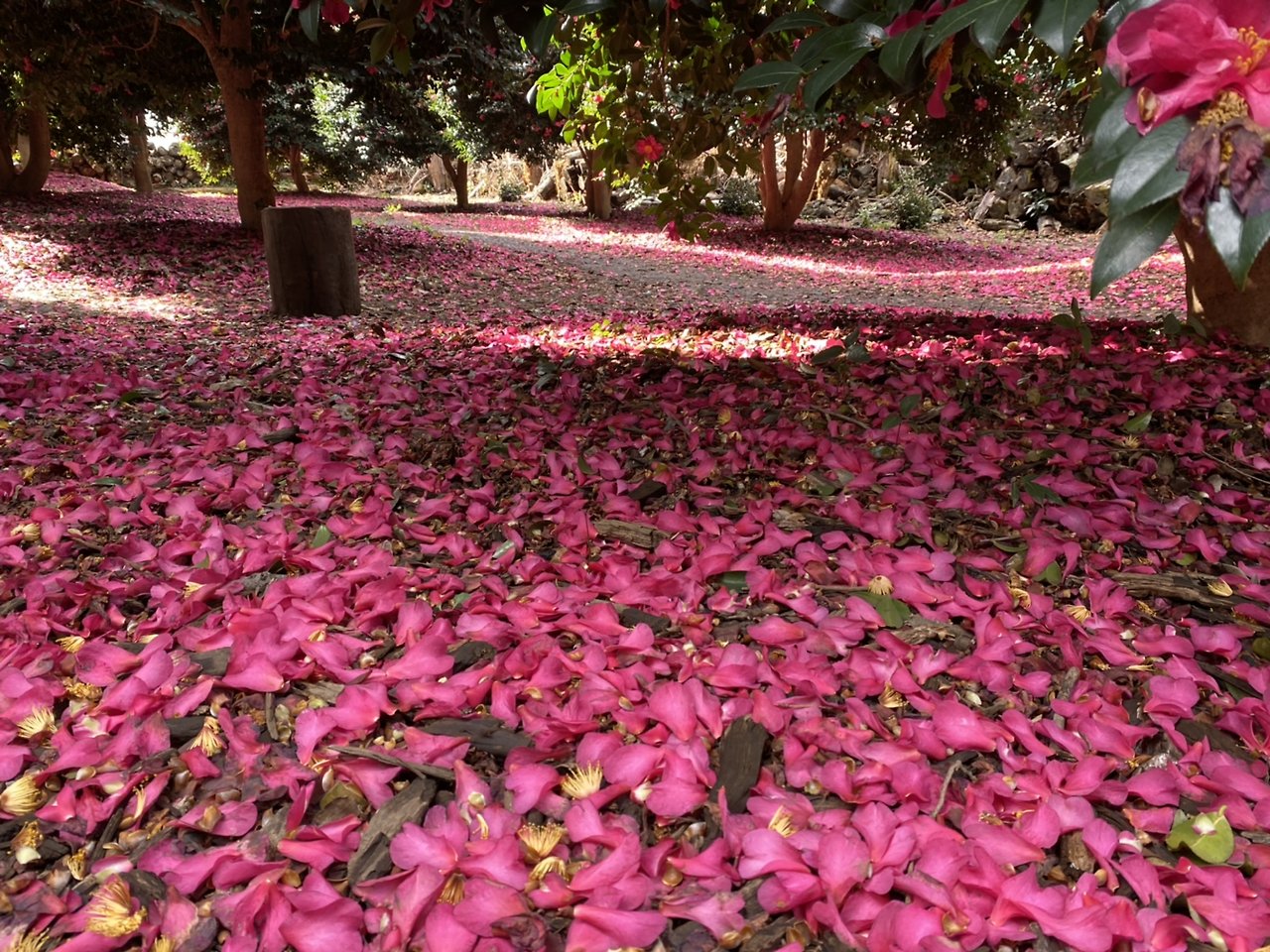 그런 날이니, 동백꽃이 만발한 수목원을 걷는 것은 더욱 기꺼운 일이다. 규모는 작았지만 탐스러운 동백나무들이 빼곡히 들어차 있다. 게다가, 연 이틀 쏟아진 겨울비와 삭풍 덕에 그 풍성한 동백꽃들이 길에 진분홍의 양탄자를 깔아두었다. 깜짝 놀랄만큼 길 곳곳에 동백꽃잎들이다. 적당한 규모의 인파만이 수목원 안을 거닐고 있어 욕심을 내 여러장 사진을 찍었다. 일본에서는 떨어지는 벚꽃의 모양새를 가장 아름답다고 생각한다나. 오늘 와서 보니 동백꽃에 비할 바가 조금도 못된다. 이틀의 비, 그 뒤에 오늘 와서 만난 동백꽃잎의 흔적들이야말로 비길 데 없는 정취다.