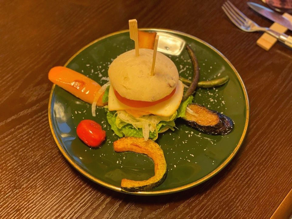 게다가, 음식들도 영 정체불명. 쇠고기와 고등어를 배합한 패티로 만든 햄버거가 가니쉬와 함께 제공된다. 문제는, 그런 특이한 패티라면 햄버거를 한입 제대로 물어 번과 채소, 소스를 함께 맛을 봐야 정확한 평가가 이루어질 것인데 요녀석은, 칼로 잘라서 따로 따로 먹을 수 있게 서빙이 되었다. 이렇게 되면 패티 따로, 빵 따로, 채소 따로 먹기 십상이다. 그만큼 햄버거의 배합된 맛이 아니라 따로 따로 재료를 먹게 된다. 일반적인 수제버거는 쇠고기 패티의 맛이 명확하기 때문에 햄벅스테이크를 먹는 감각으로 이렇게 따로 먹어도 큰 문제는 없지만, 생소한 음식을 접하는 손님들에게는 이런 방식이 음식에 대한 선입견을 키울 서 있다. 음식의 컨셉과 서빙방식이 충돌하는 측면이 있다.