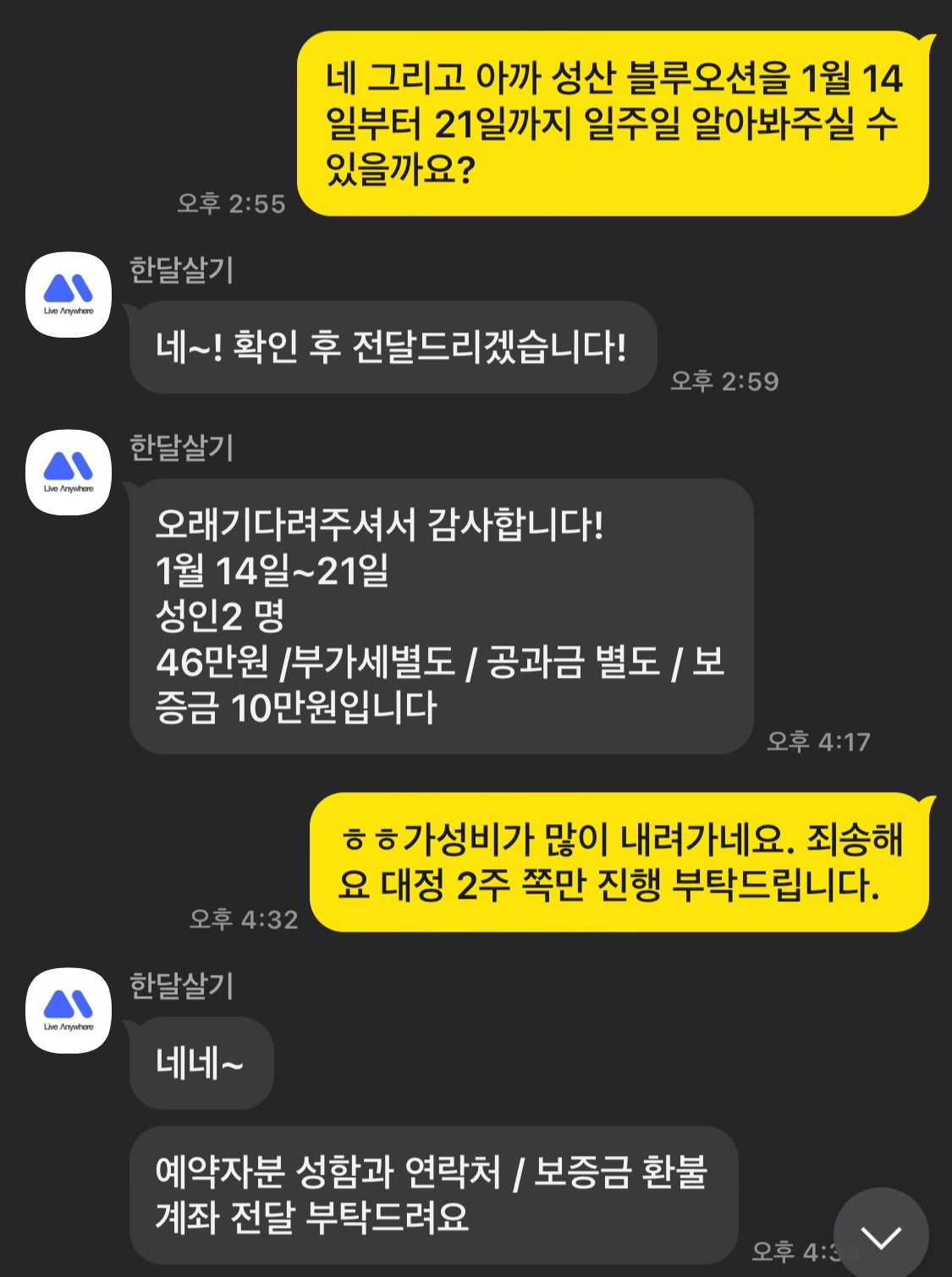 한달살이 앱의 경우엔 일반 숙박어플처럼 여러 숙소를 사진 중심으로 빨리 빨리 볼 수 있고, 중간단계를 거치기 때문에 허위매물의 위험이 낮은 편입니다. 다만 사업체가 작아 응답시간이 늦습니다. 그리고 허위매물의 위험성이 낮은 대신, 내가 원하는 날짜에 맞추긴 어렵습니다.