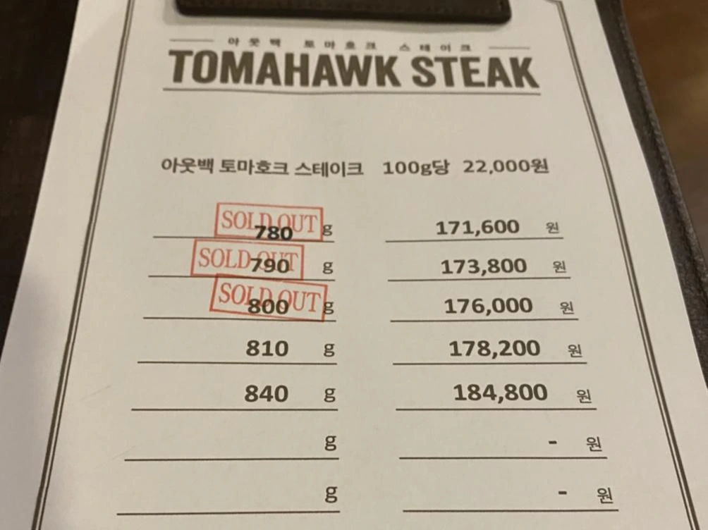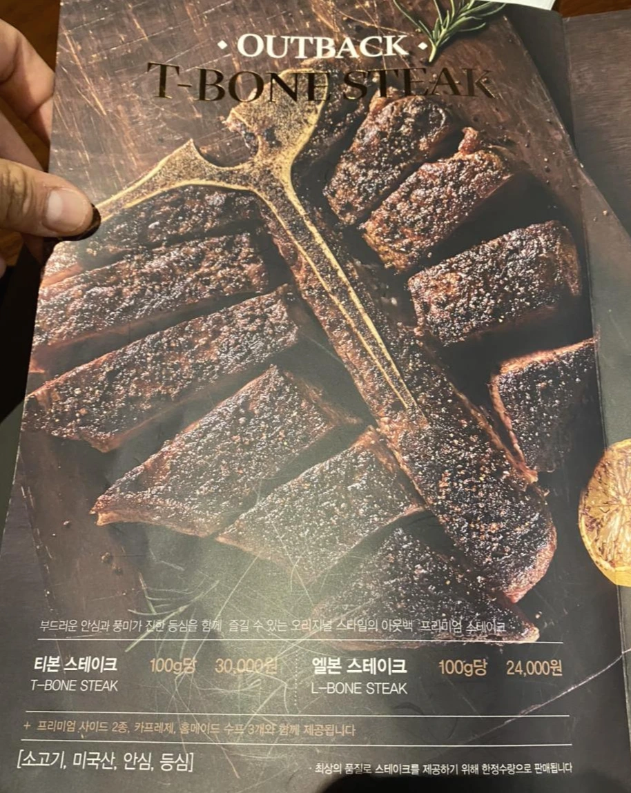 버거킹으로 인해 품고 있던 의심은 하루 뒤 아웃백에 와서 다시 불이 붙었다. 한국인에게 선호도가 높지 않은 비싼 스테이크부위들을 패밀리레스토랑인 아웃백에서 제공하는 것은 합리적이지 않다. 그 맛을 아는 사람들이 전문 스테이크 하우스에서 주로 찾는 메뉴들이다. 게다가 덩어리는 800그램. 단위도 너무 크다. 일반적인 아웃백의 스테이크 사이즈인 200g 내외에서 너무 크게 벗어난다. 대체 무슨 일이 일어나고 있는 것이지?
