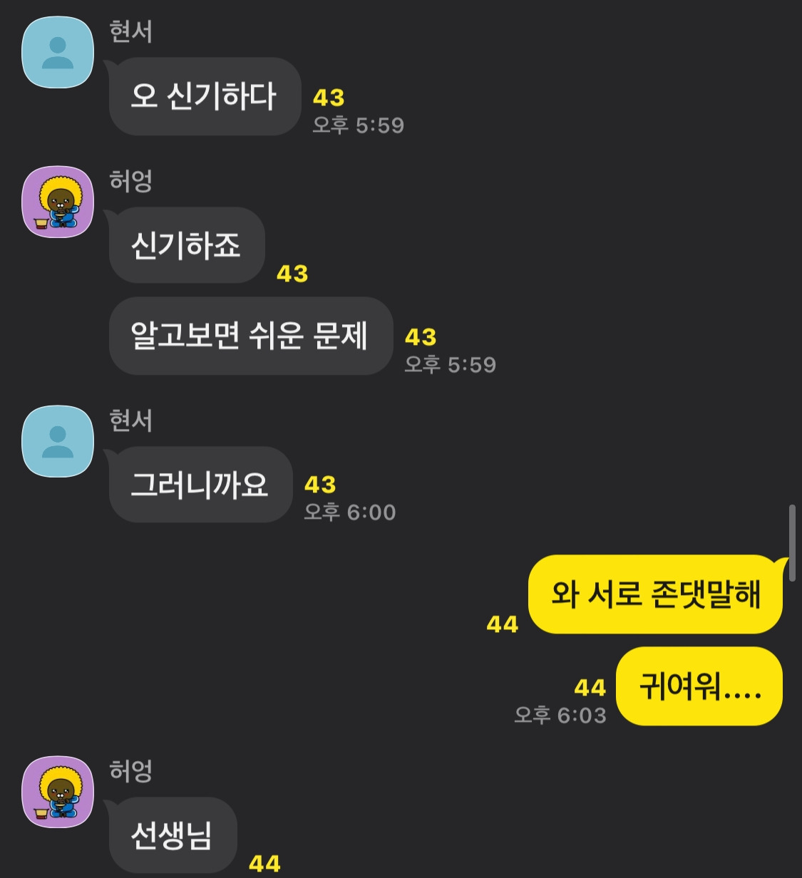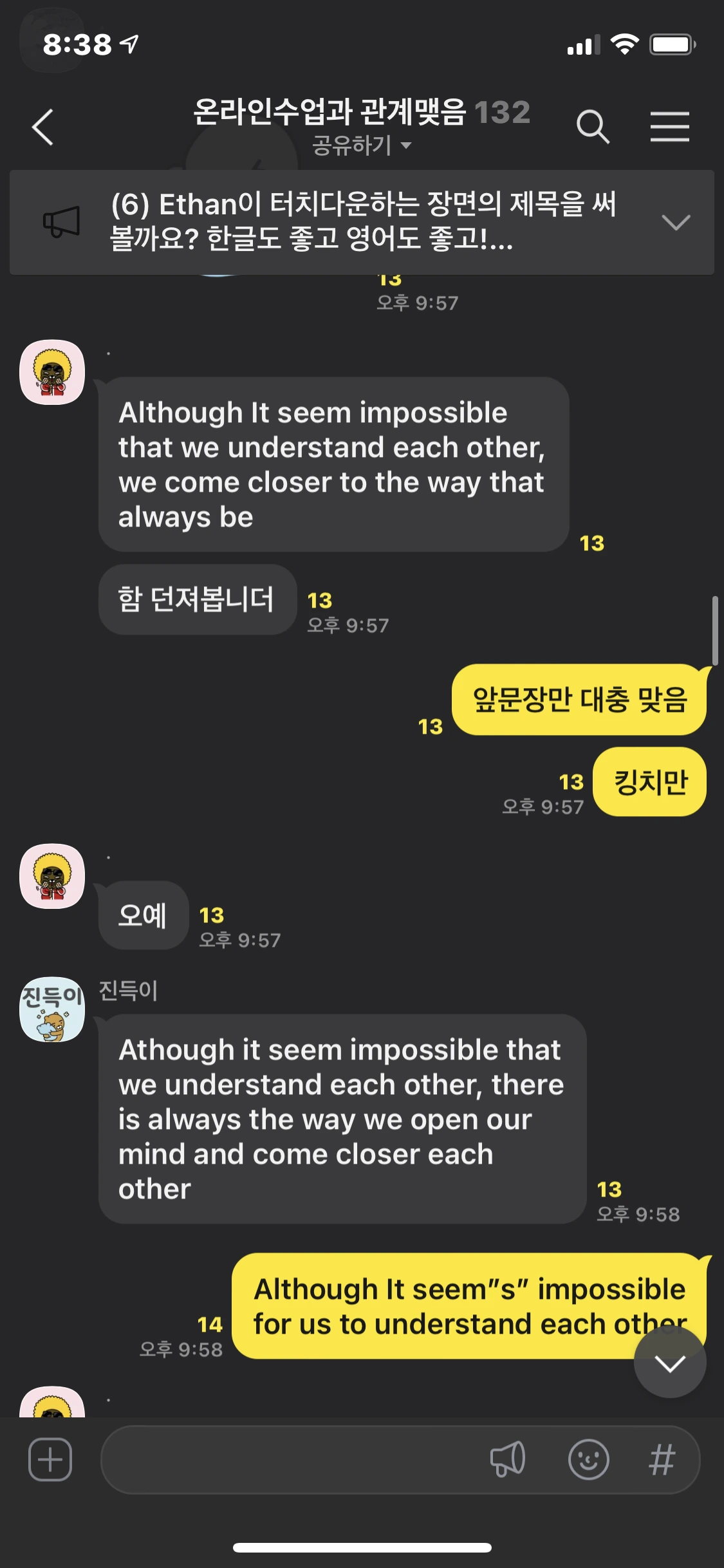 아이들이 떠먹여준 관계성만큼이나 교사인 나 역시 아이들의 관계성을 발달시키기 위한 노력을 계속하고 있다. 먼저 지난해 만든 단톡방에 1학년들을 불러들였다. 나는 올해 1학년 2개 학급, 2학년 2개학급의 영어 수업을 지도한다. 작년부터 영어공부 톡방에 들어와 있는 아이들까지 130여명이 이따금 나갔다 들어왔다 하며 같이 영어 이야기를 하고 있다.