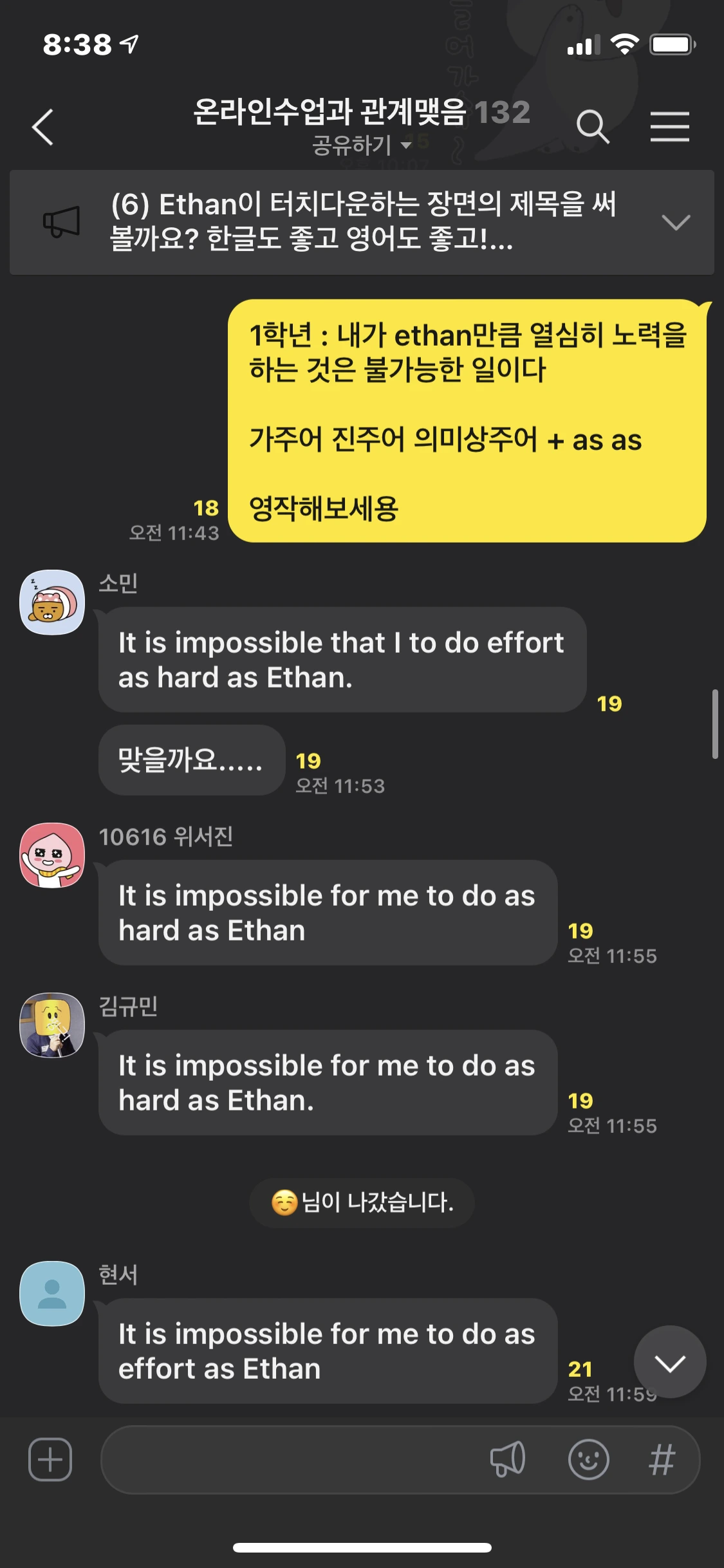 톡방에서 영작활동도 다시 시작했다. 지난해 1학년 수업에서는 지필평가(중간/기말고사)에 출제되는 서술형평가를 대비해주기 위하여 매일같이 영작을 시키고 피드백을 해주곤 했는데, 내 수업을 듣지 않는 학급에서 슬슬 공정성 문제가 나오기 시작했다. "우리는 안내 못받았는데 저 선생님 들어가는 반은 매일 영작 연습시켜주네?" 라는 이야기들. 그래서 가을에 접어들면서는 영작을 거의 시켜주지 못했다. 그럼에도 불구하고 톡방에는 100명 가까운 아이들이 그대로 남아있었고, 이따금 이런 저런 질문이나 수다를 떨며 관계성을 유지하고 있었다. 그런데 여기에 1학년이 새로 들어오니, 병아리같은 아이들이 영작에 도전하고, 그것을 보며 2학년들에게 훨씬 어려운 영작 과제를 부여해주며 양쪽의 발전을 지켜볼 수 있다. 즐겁잖아!