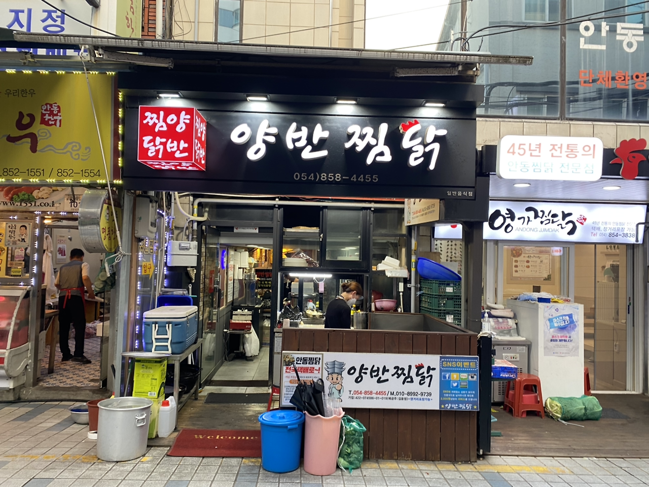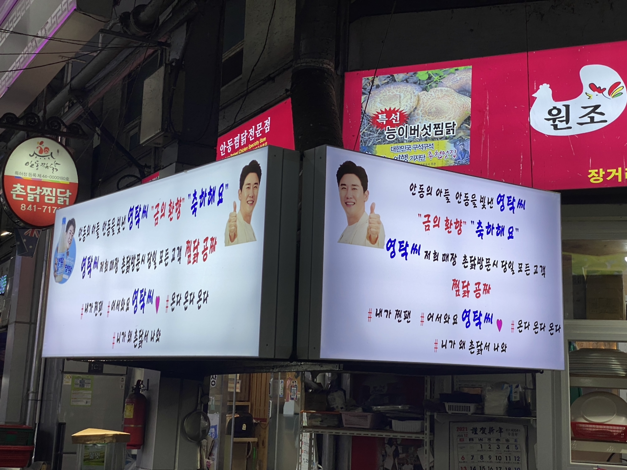 바깥양반은 안동을 당일치기로 전에 한번. 나는 오늘이 처음 여행이다. 요 근처 풍기까진 몇해 전에 와서 일박을 한 적이 있다. 당연히 첫 끼니는 찜닭이어야 할 텐데 안동 옛시장의 찜닭골목이 그럭저럭 재미가 있다. 가수 영탁의 사진을 재밌게 전시한 가게도 있고, 눈으로 대충 보기에 한 20개는 넘는 찜닭집들이 저마다 활기가 있다. 내일 가기로 한 숙소에서 추천한 식당을 가면 3000원을 할인해 준다기에 별 고민을 하지 않고 들어가 주문을 했다. 보통맛으로 25000원이다. 그런데...