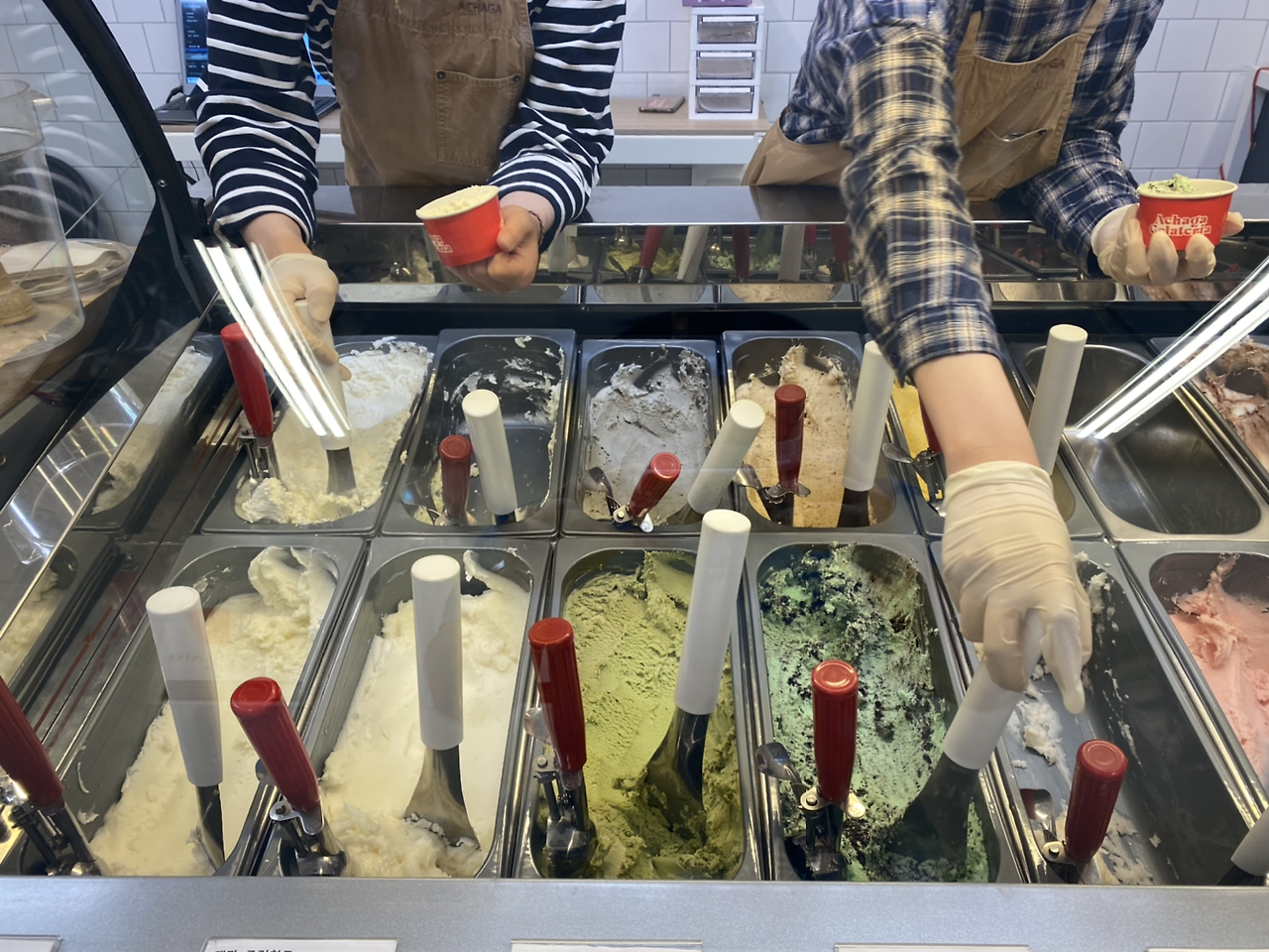 맛있다. 크림치즈의 눅직한 맛도 대파의 매콤한 맛도 우유 아이스크림에 살짝 녹아든 모양새다. 대파의 식감은 여전히 사각사각하지만, 젤라또는 아주 맛이 좋다. 그래서 재밌다. 그래서 다시 일어나 가게 이곳저곳을 다시 구경하며 스티커도 챙기고, 남은 아이스크림도 무엇이 있나 구경을 했다. 뭐어 떠 와서 다른 젤라또를 먹겠다고 할 건 아니지만서도. 대파를, 정말로 조금이지만 정말로 썰어서 넣은, 젤라또는, 처음 들른 방문자에게 그런 재미난 첫인상을 남겼다.