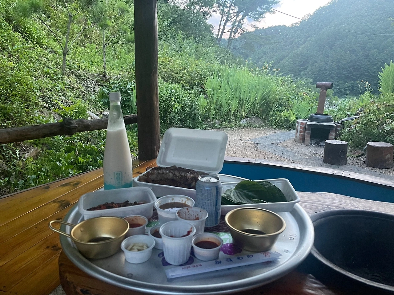 조금 쉬다가 저녁을 먹을 시간이 되어 포장해 온 족발을 평상에 깔았다. 서울에선 사람들이 찾아가며 먹는다는 꽃무늬 상에, 읍내의 마트에서 사온 동강주조 막걸리까지. 밤이 되어가니 산촌의 바람은 솔솔 더위를 잊게 해주고, 민박을 찾은 저마다는 고기를 구우며 냄새를 피운다. 모기는 다행히 많지 않다.