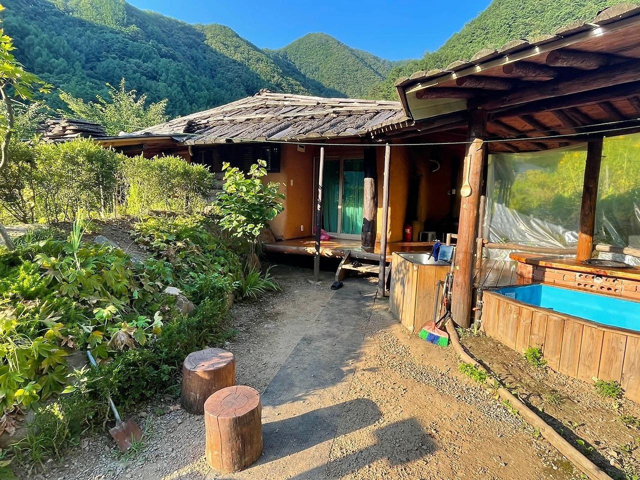 이렇게 몇채의 건물 중 위쪽 "하늘채"가 우리가 머물 방이다. 두평 약간 안되는 크기에, 차에서 짐을 들고 들어가기가 고약한 자리다. 그러나 방 안에 에어컨도 잘 돌아가고 돌담엔 양쪽으로 통유리가 풍경을 환히 밝혀주고 있다. 무엇보다도 마루를 앞으로 길게 평상까지 이어 빼서, 그곳에 수박을 담그거나, 발을 담그거나 하며 고기를 구워먹을 화로까지 만들어져 있었다.