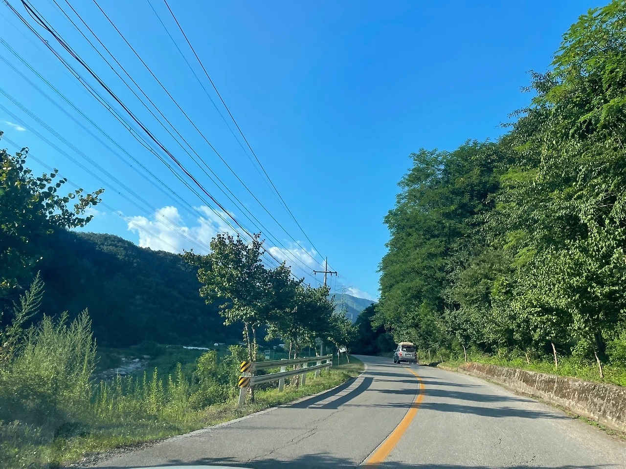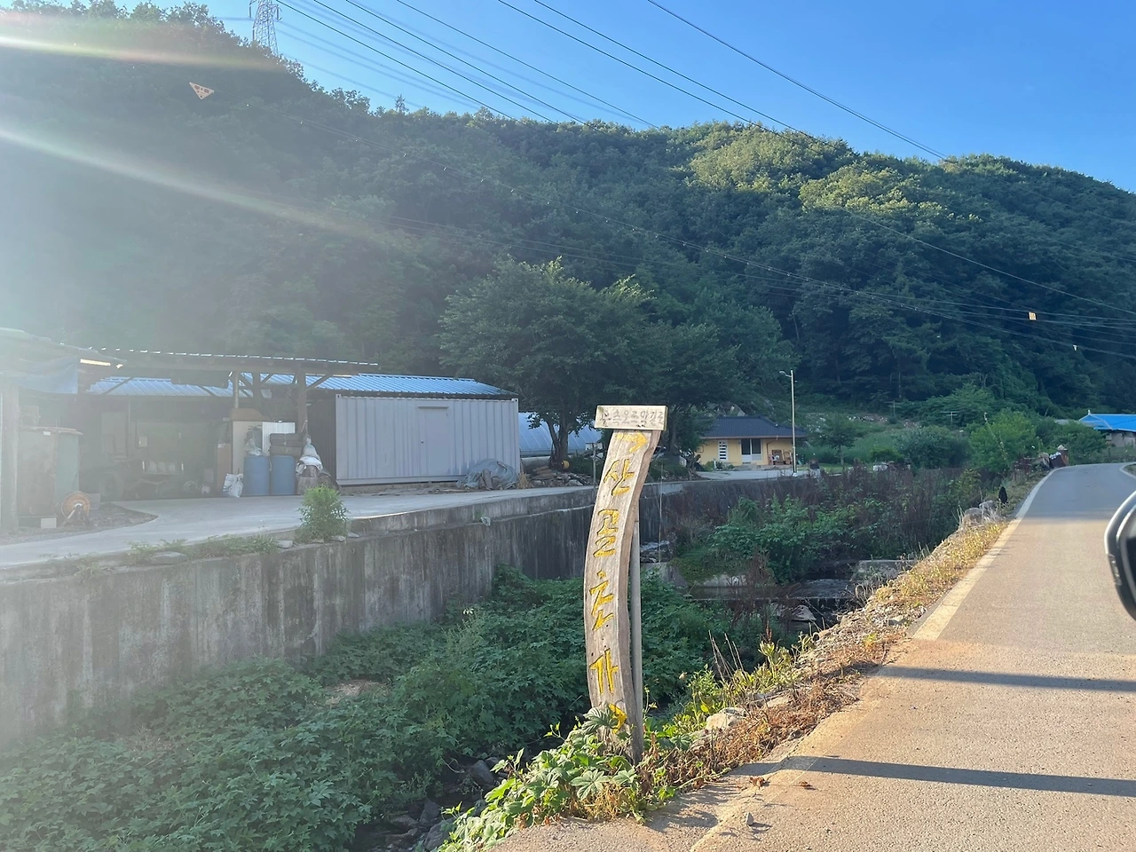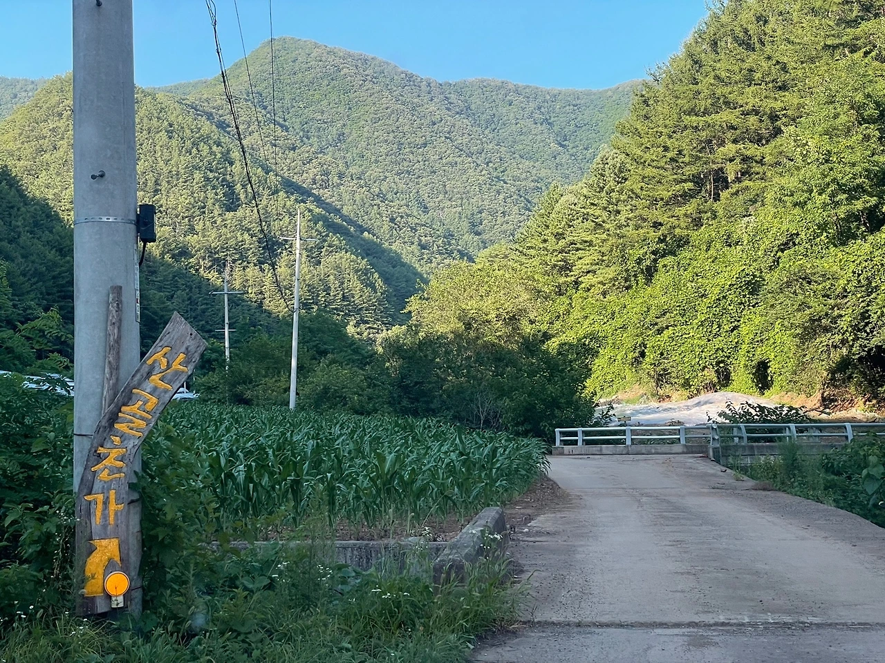 땀을 식히고 아직 해가 중천이지만 우리는 슬슬 다시 길에 오른다. 읍내에서 30분 걸리는 "산골초가" 민박이다. TV 프로그램 삼시세끼에도 방영된 유명 숙소라고 하는데 조금 차를 달리자 이제 굽이굽이 시골길이다. 도로를 벗어나 농로 사이를 달린다. 들어가는 길엔, 곳곳에 나무로 된 표지가 서 있다. 리뷰에서 평이 갈려, 예약을 한 바깥양반이나 나나 걱정이 적지는 않은데 나야 시골집은 익숙하다.