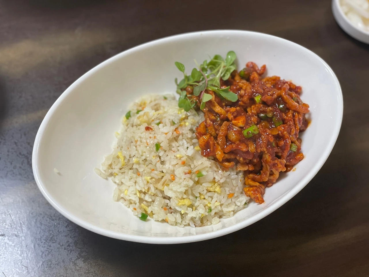 그런데 재미난 것은 볶음밥이었다. 볶음밥이 재밌지만 않았어도 따로 글을 쓰지 않았을 것 같은데, 볶음밥에 고기볶음이 고명으로 올라와 있는데, 밥이랑 거의 1:1 비율이 될 만큼 양이 많다. 그런데 이 고기볶음이...엄청 단짠단짠 불향이 강한, 정석 제육볶음이다. 이 부분에서 놀랍기도 하고 인상이 깊기도 했다.