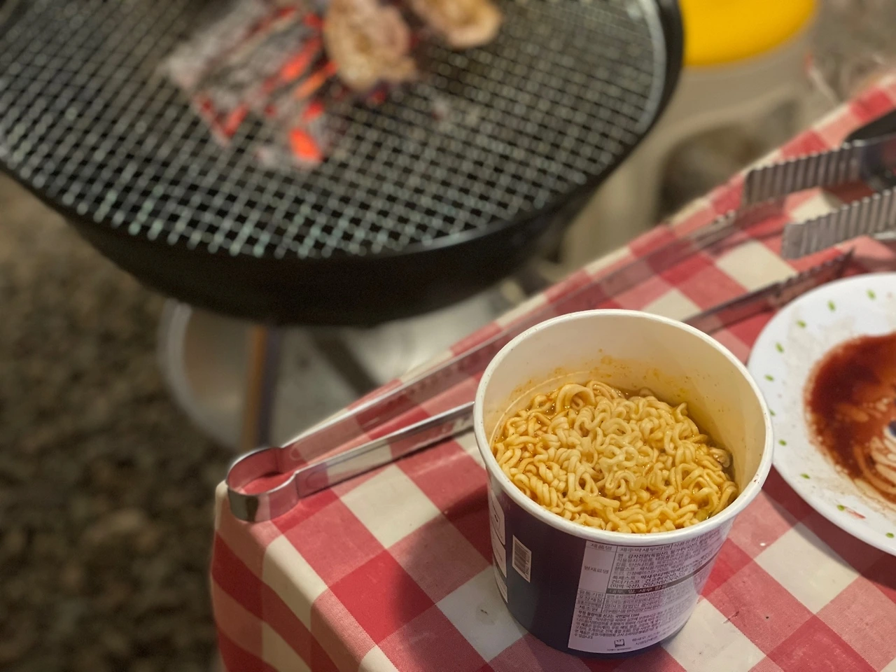 사장님이 구워주신 백탄 숯이 화력이 약하다더니만, 삼겹살이 타지도 않고, 불이 크게 올라오지도 않는다. 대단한데! 식당가서 삼겹살을 굽듯이 마음껏 고기를 올렸다. 그런데 그 고기들이 정말이지 지글지글. 쇠고기도 같이 올린다. 금새 익었다.