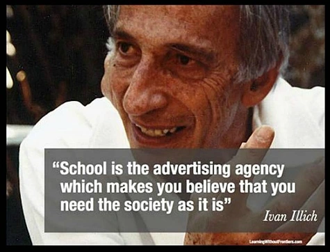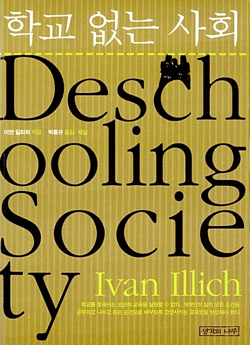 이반 일리히의 Deschooling Society는 1971년 출간된 이래 <탈학교 사회>, <학교 없는 사회>라는 제목으로 국내에도 소개되었다. 그러나 그의 교육론을 정확히 전달하기 위해서는 <학교제도로부터 해방된 사회 만들기> 정도가 적절한 번역이 될 수 있을 것이다. 민중적 신앙인으로서의 삶의 자세를 평생 고수한 그는 사회제도가 인간의 삶을 왜곡하는 한편 자본예속을 강화한다고 진단했다. 문명의 발전으로 의료, 교통, 교육, 정치 등이 제도화되었지만 이는 곧 자연 상태의 인간이 일상을 통하여 향유하던 정당한 노동(work)의 가치가 박탈된 것을 의미한다. 자율적, 자연발생적인 다양한 노동의 요구가 제도에 의해 소멸되었다는 것은 곧 제도에의 예속을 뜻하기에 현대의 인간은 스스로의 노동에 대하여 사고할 기회도, 결정할 권리도 갖지 못하게 되었다는 것이다. 특히 일리히에게 학교 교육은 매우 핵심적인 반인간적 제도로 인식되었는데, 그것은 학습이라는 인간의 원초적 행위양식이 학교 교육을 기준으로 분류되고, 학교교육을 벗어난 배움 활동이 부정되거나 망각되며, 그로 인하여 평생에 걸쳐 발생하게 되어 있는 자율적인 배움, 인간의 본질이 제도적 통제에 의해 훼손되는 결론으로 이어지기 때문이다.
