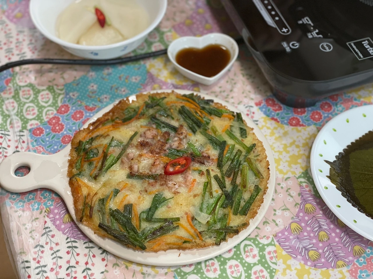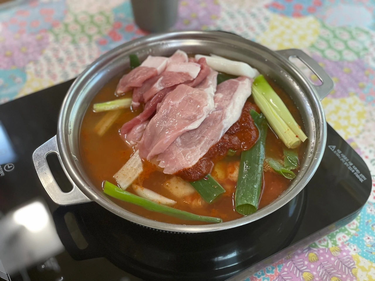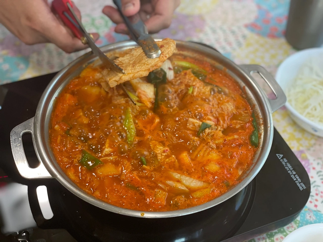 그런데 더 재밌는 건 이 식당의 괴상한 영업방침이다. 처참한 회전율의 접객 방식이다. 반찬이 하나 하나 모두 집에서나 쓰는 접시에 담겨나오는데, 그게 다 계란후라이, 깻잎절임, 게다가 미니멀한 부추해물전...그리고 메인메뉴인 짜글이는 생고기와 생김치를 그대로 내와서 테이블 위에서 끓이는데, 한 20분 동안 끓이면서 그걸 손님이 다 가위로 썰어야 한다. 알아서 먹도록.
