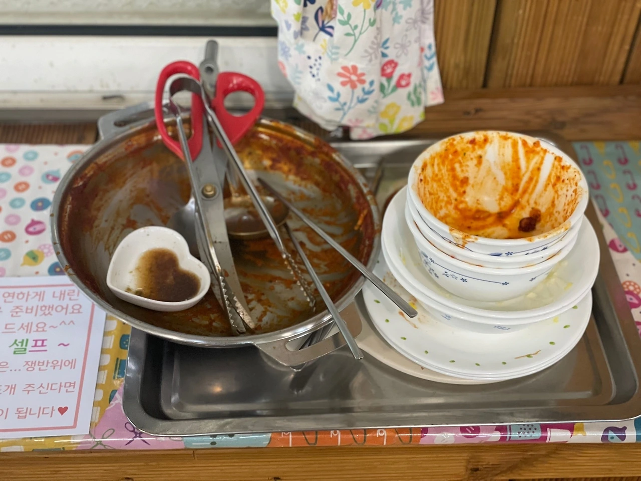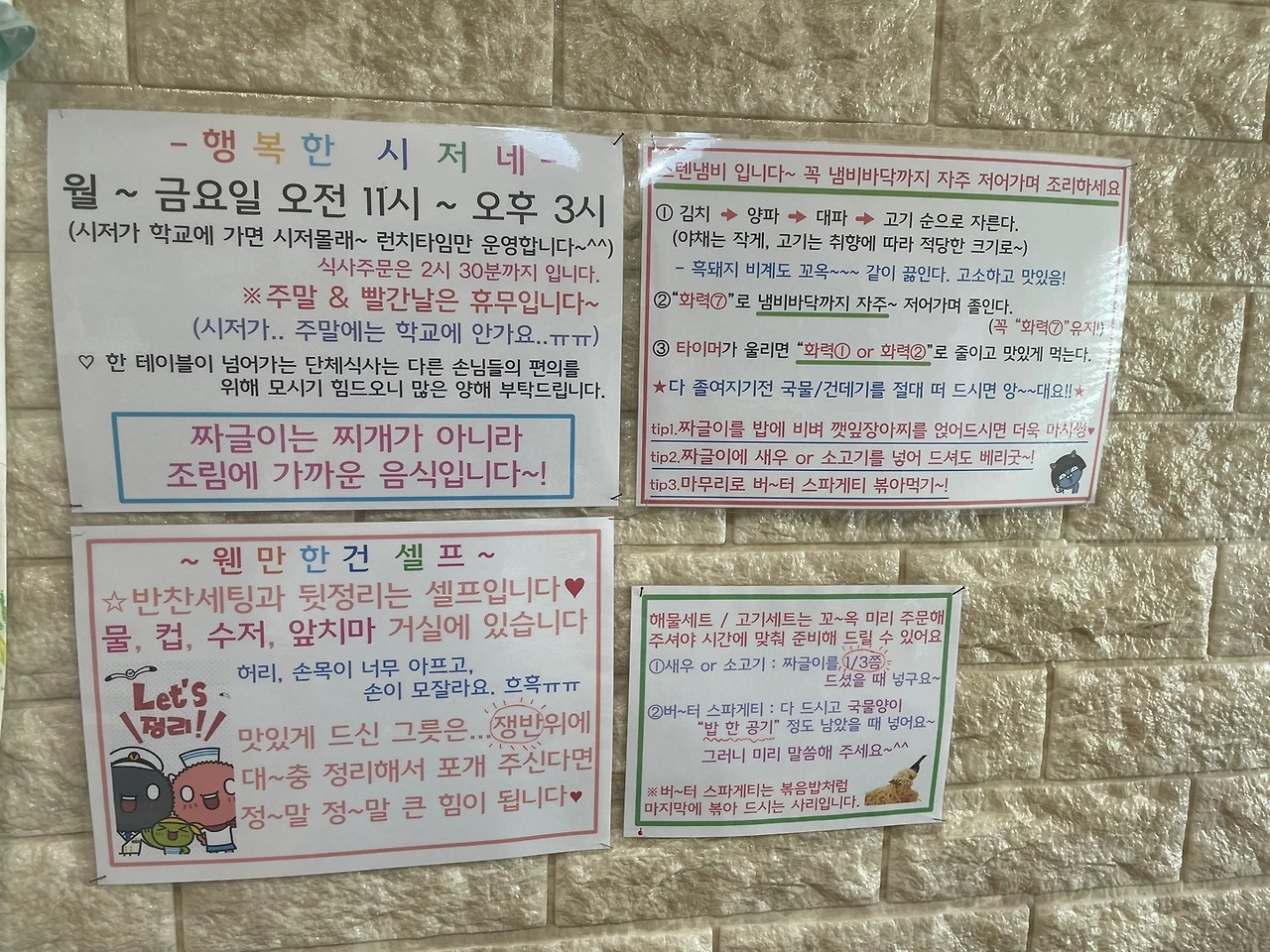 사장님은 따로 홀 직원을 두지 않고 두분이 모든 걸 하고 있다. 그래서 테이블 옆자리에는 후식이나 반찬을 올려두는 선반이 있다. 반찬은 상차림을 미리 해주셨는데 후식인 체리와 매실청은 선반에 두고 가셨다. 그리고 가게 벽에 걸린 팻말에는 접시 정도는 포개서 놔달라고 하니, 야, 나는 방금 아침 먹고 설거지까지 한 사라밍거든? 하며, 웃으며 그릇을 탁탁 치웠다.
