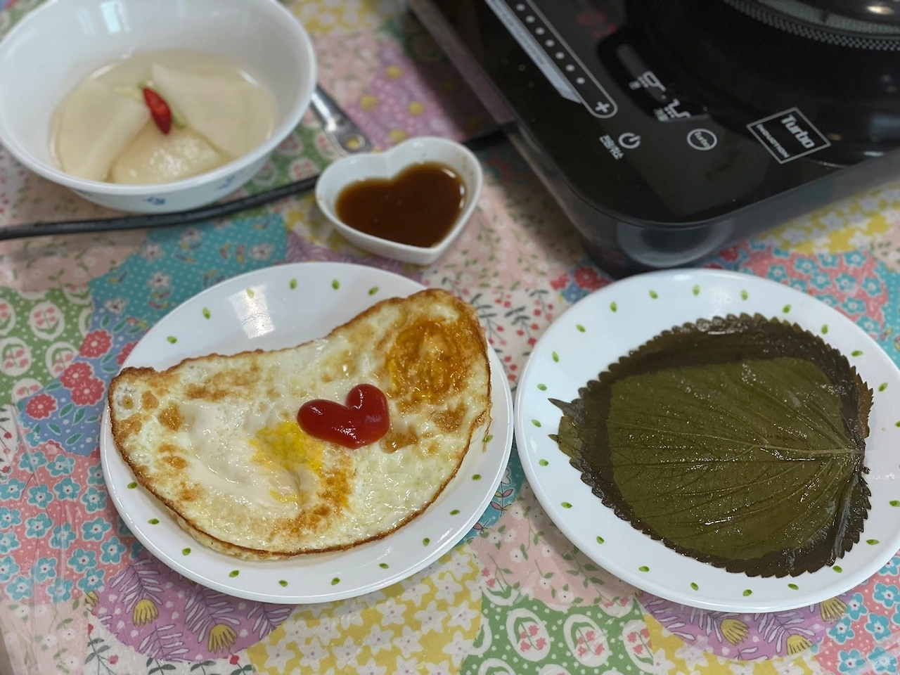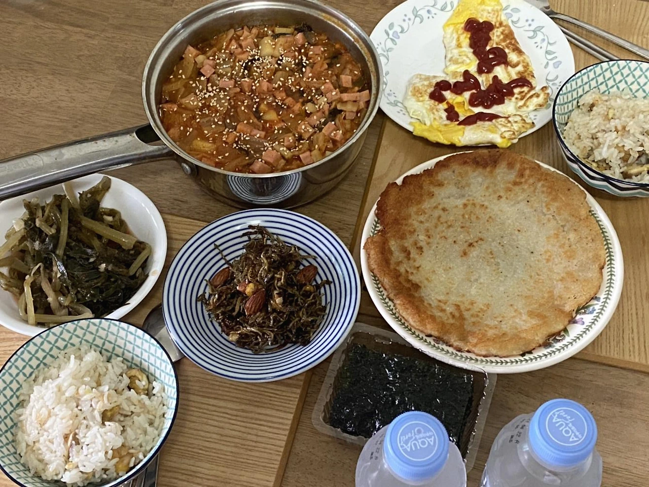 집밥은 그래야 하지. 나는 상을 차리던 와중이라 행복한 시저네 처럼 계란후라이를 예쁘게 굽지 못했다. 그런데 집밥은 원래 후라이 저러지 않나? 그래도 밥은 내가 훨씬 잘 지었다. 공주에서 말린밥을 사서 함께 넣고 밥을 짓는데, 찰지고 달고 구수하다. 밤밥. 정말 맛있지. 여기에 잘 익은 열무에 갓 볶은 멸치까지, 그리고...김! 상차림이 끝났다.