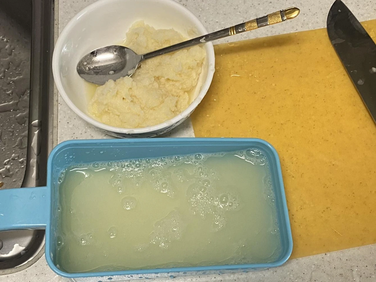 따라한다. 부침개를 하려고 냉장고를 찾아보니 감자와 양파. 채소 끝. 김치전을 하는 수도 있지만 어차피 짜글이를 할 거니까. 제일 먼저 감자전을 사각사각 갈아서는 녹물을 빼기 위해 물을 조금 부어놨다. 30분. 쌀이 밥이 되는 시간. 짜글이가 익어가는 시간. 내가 반찬을 충분히 만드는 시간.