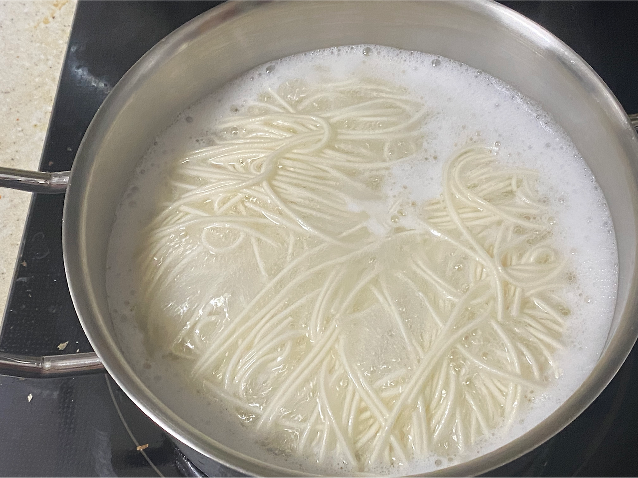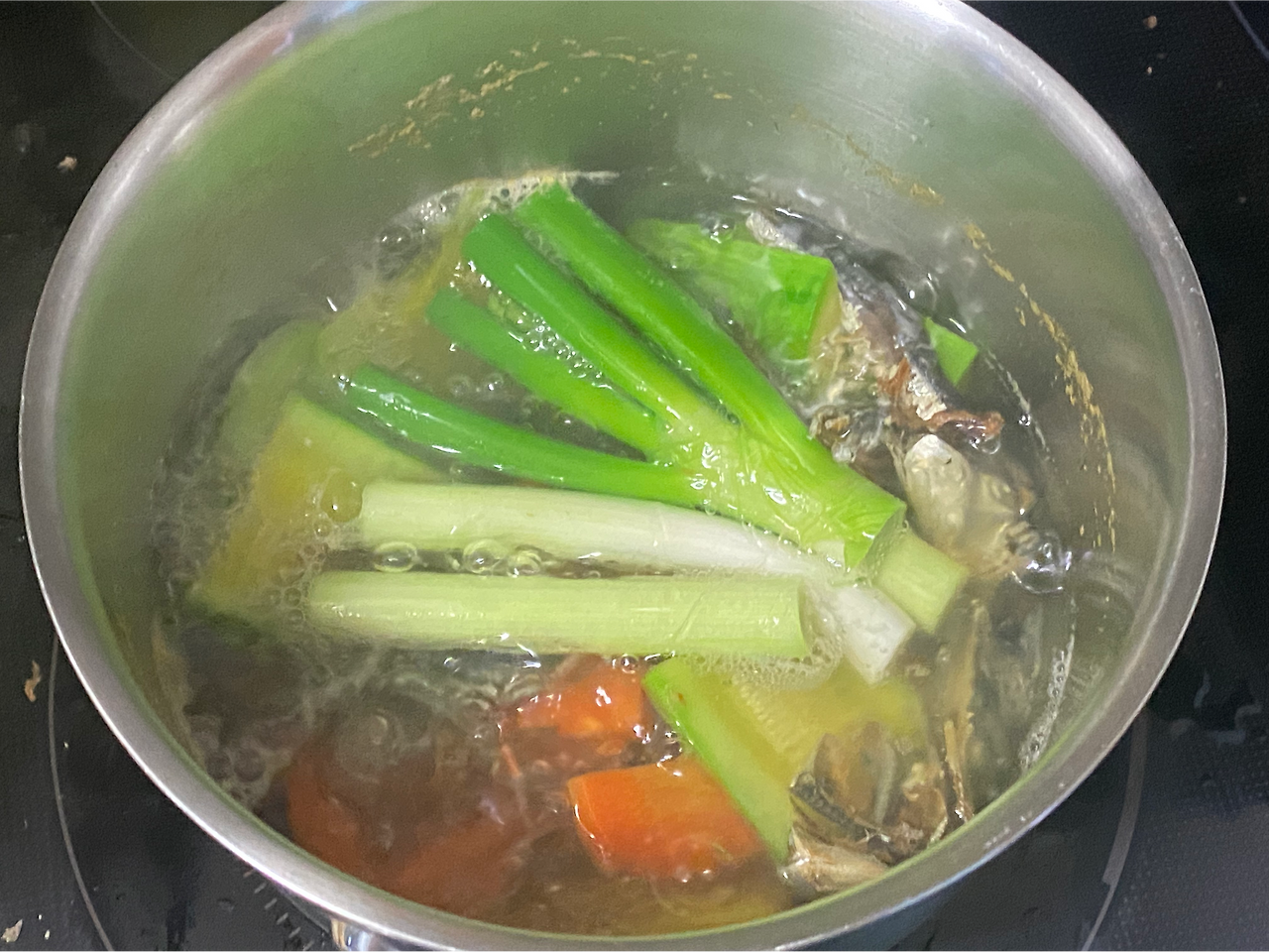 그런 나는, 면을 씻어서 미지금한 상태에서 수분을 빼면서 냄비의 육수를 봤는데 뙇.